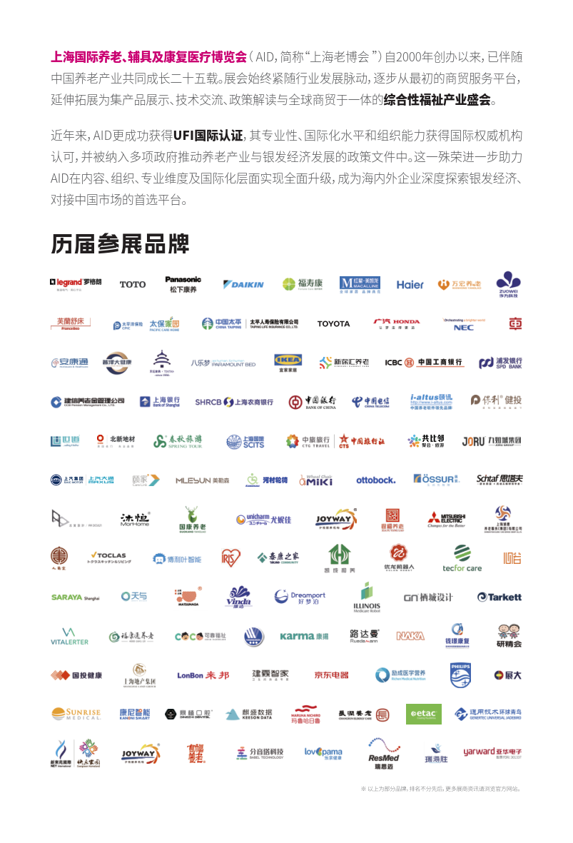 近年来,AID更成功获得UFI国际认证,其专业性、国际化水平和组织能力获得国际权威机构认可,并被纳入多项政府推动养老产业与银发经济发展的政策文件中。这一殊荣进一步助力AID在内容、组织、专业维度及国际化层面实现全面升级,成为海内外企业深度探索银发经济、对接中国市场的首选平台。