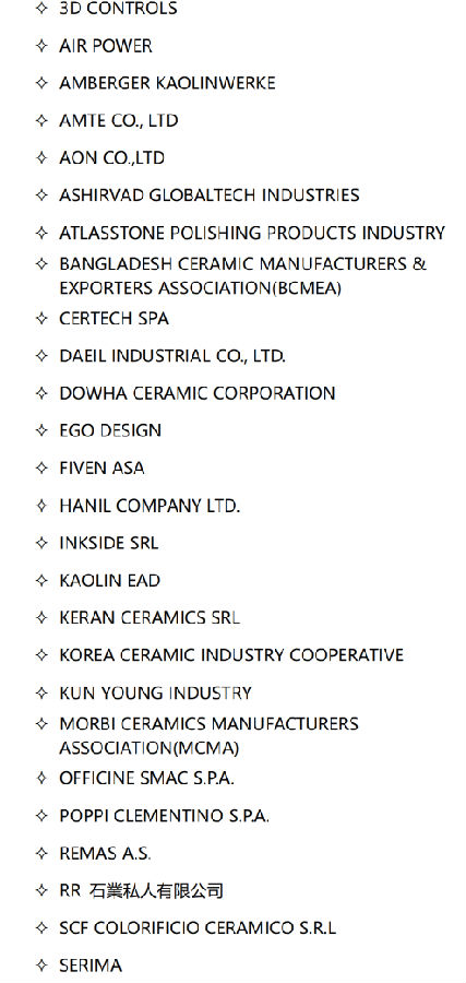 参加本届展会的参展企业和品牌来自中国、意大利、西班牙、德国、韩国、印度、日本、印度尼西亚、越南、伊朗、孟加拉、土耳其、英国、法国、俄罗斯、澳大利亚、美国、巴西、阿根廷、中国台湾、中国香港等20多个国家和地区,涵盖了陶瓷技术装备和材料行业发展处于优势和领先地位的绝大多数国家。