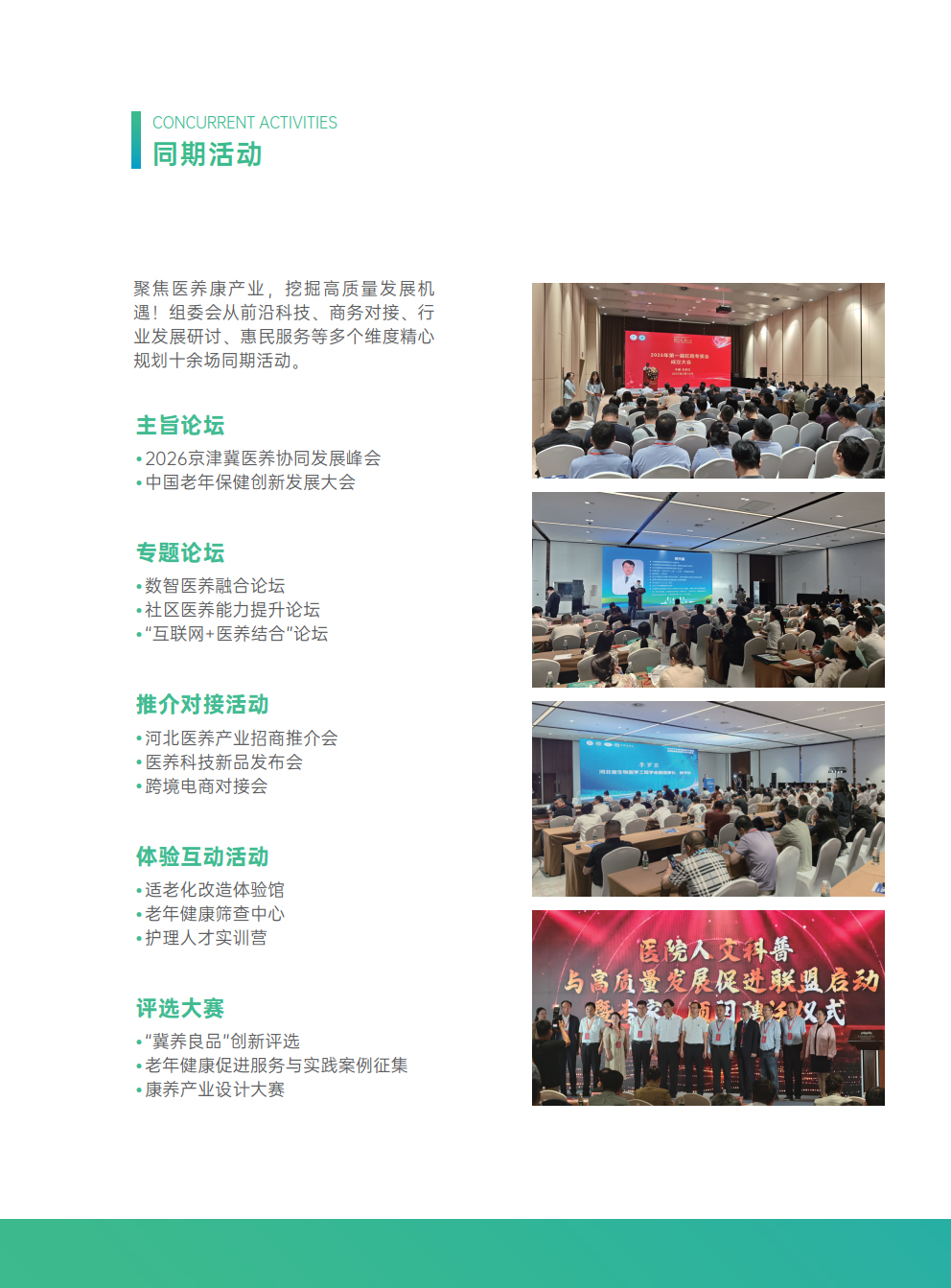本届展会规划了康养康复馆、医疗影像馆、口腔器材馆三大展馆,细分康复医疗、养老福祉、智慧健康、中医养生等多个展区,全面展示医养产业最新技术、产品与服务,涵盖护理床、智能养老设备、中医理疗产品、口腔器材等全品类展品,构建完整的医养产业生态链,满足行业多元化需求。同时,展会还将同期举办国际健康产业大会、医康养产业融合技术对接会等十余场专业活动,搭建高效供需对接平台,助力企业挖掘商机、提升品牌影响力。