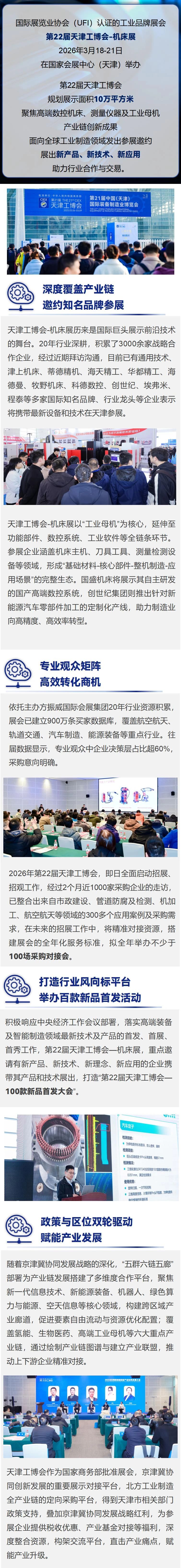 由国家商务部批准的第22届天津工博会-机床展将于2026年3月18-21日在国家会展中心(天津)举办。天津工博会-机床展是国际展览业协会(UFI)认证的国际品牌展会,立足中国先进制造研发基地——天津,展出面积近100,000平方米,服务我国工业装备产业发展,历经20载口碑积累,汇集全球范围内机床领域的数字化、智能化、信息化创新成果,吸引了蒂德精机、丽驰、程泰、绮发、津上、山崎马扎克、国盛、亿晋、东刚、宝锋、大金等知名品牌参展,获得了政府机构、行业商协会、参展企业及买家用户等合作伙伴的一致好评,充分展示了展会对产业发展、工业升级的正向推动作用。