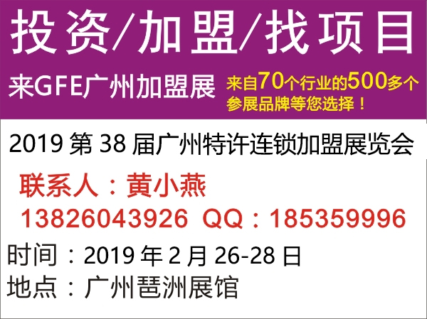 “2019第38届广州特许连锁加盟展览会”将于2019年2月26-28号在广州琶洲展馆举行,GFE广州特许连锁加盟展将为广大创业投资者带来众多优秀的海内外特许连锁品牌,是特许连锁企业展示品牌、招募加盟合作的平台。诚邀各企业、投资者前来参展、参观。