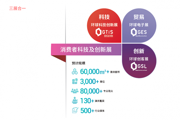 CTIS以 “传播·启迪·人脉” 为核心价值,首创独特的 “三展合一” 模式 -- 环球科技创新展(Global Technology & Innovation Show, 简称GTIS)、环球电子展(Global Electronics Show,简称GES)以及环球创客展(Global Startup Launchpad,简称GSL),以科技带动产业创新,以贸易促进产业发展。从概念到应用,从产品到品牌,构建 “立足中国,面向全球” 的创新型多元消费者科技生态圈。
