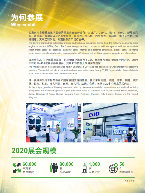 内容摘要: 2020第十届中国上海国际汽车模具及技术装备展览会 China Shanghai International Automotive Mould Technology Equipment Exhibition 展览时间:2020年8月7-9日 展览地点:上海新国际博览中心(浦东.龙阳路……