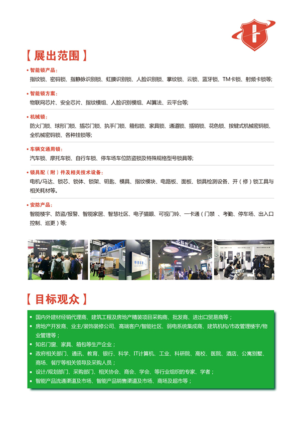 欢迎参加2020第七届广州国际锁具安防产品展览会,简称“锁博会”本届展会以‘智能生活、锁定未来’为主题,聚焦全球锁具产品创新、加快锁具行业发展,推动传统锁具智能化升级,为了更好地配合展会交易、技术交流合作与推广的办展目的,进一步丰富广州锁博会的配套活动,主办方精心组织了一系列重要活动,以前沿视角、科技驱动为切入点,搭建交流合作平台,本届展会的全面推广策略,更由中国辐射至亚太地区及全球专业买家,让展商更能有效开拓中国以至海外国际市场,加强与目标买家接洽的机会。辉科展览凭借在国际会展组织的丰富经验,整合产业资源,为企业提供一个国际化、专业化、高品质的交流、洽谈、交易与合作的平台。