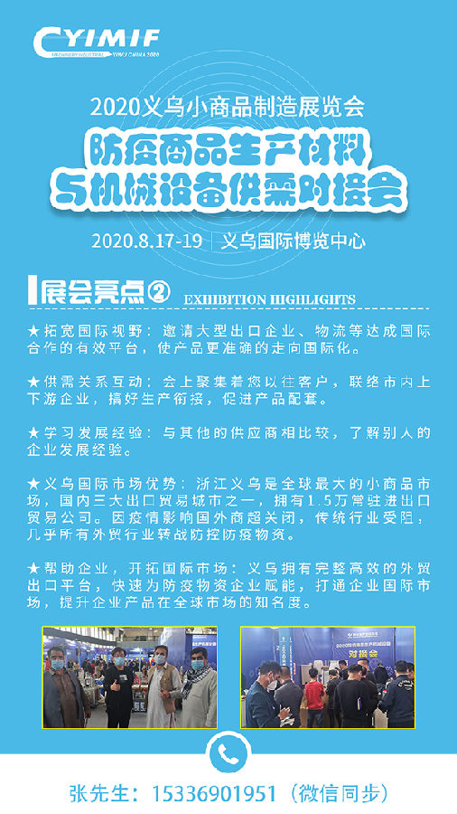 随着疫情在全球的蔓延,目前,防疫战疫已进入攻坚阶段,为深入贯彻习近平总书记关于做好疫情防控工作的重要指示批示精神,全面落实中央、省委、市委的工作部署,进一步促进防疫物资供需双方对接,特举办"2020义乌小商品制造展览会-防疫商品、生产材料与机械设备对接会",进一步发挥“防控阻击战”平台功能,建立供需快速影响机制,精准高效连接生产制造商、出口平台、物流供需产业链,以推动中国防护防疫产业升级供需对接与发展。举办此次对接会活动,就是搭建平台、变散为整,让采购商和经销商更好地实现对接。旨在拓宽防疫商品销售渠道,精准对接国内外采购商,满足当前全球对防疫商品的迫切需求,更好地搭建全球防疫物资供需平台。希望通过对接会的举办聚焦防疫用品产业链,进一步扩大产业的商贸空间,让行业内更多的生产、供应企业和买家通过展会的沟通交流,建立联系实现合作共赢,同时满足各地出口贸易商和跨境电商企业对防疫物资的采购需要,真正实现防疫物资产能‘供需对接’,助力全球抗疫。