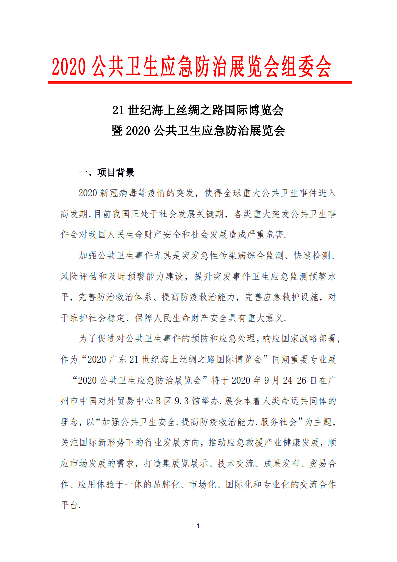 为了促进对公共卫生事件的预防和应急处理,响应国家战略部署,作为“2020广东21世纪海上丝绸之路国际博览会”同期重要专业展—“2020 公共卫生应急防治展览会”将于2020 年9月24-26日在广州市中国对外贸易中心B 区9.3 馆举办.展会本着人类命运共同体的理念,以“加强公共卫生安全.提高防疫救治能力.服务社会”为主题,关注国际新形势下的行业发展方向,推动应急救援产业健康发展,顺应市场发展的需求,打造集展览展示、技术交流、成果发布、贸易合作、应用体验于一体的品牌化、市场化、国际化和专业化的交流合作平台.