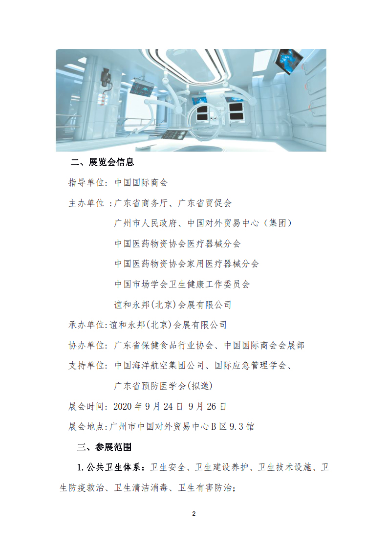 内容摘要: 2020公共卫生应急防治展览会 Protection and Prevention Equipment for Public Health and Emergency Exhibition2020 时间:2020年9月24-9月26日 Time: 24 th -26 th September 2020 地点:广州市中国对外贸易中心B区9.3馆……