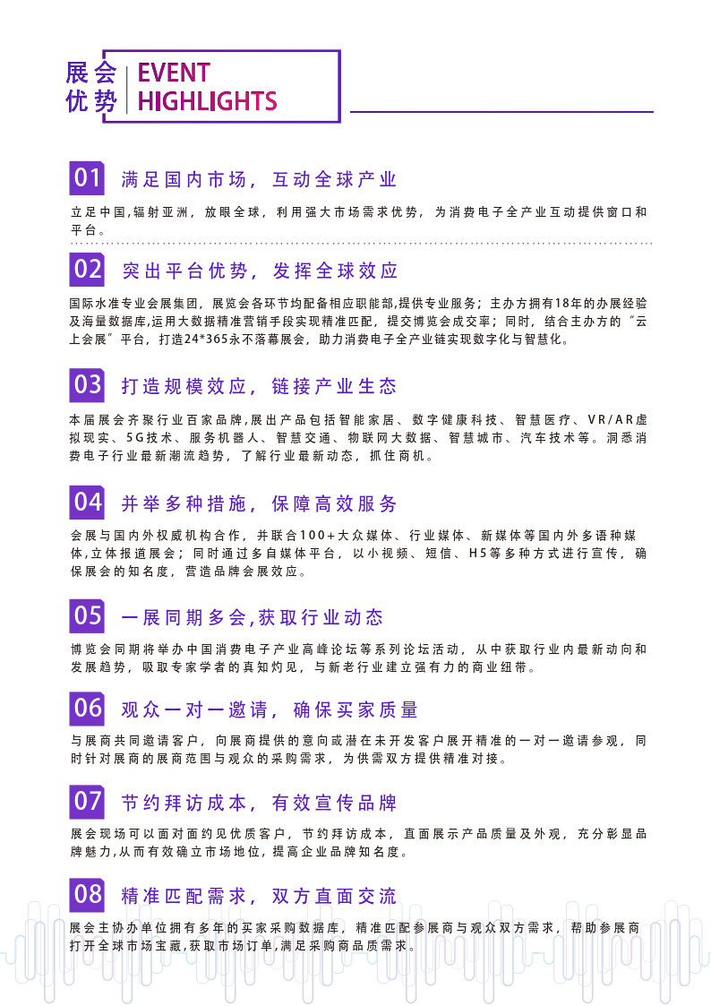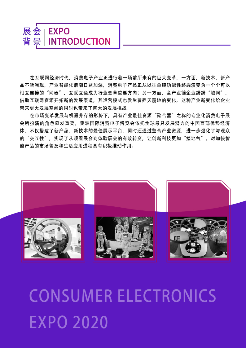 内容摘要: 2020亚洲国际消费电子博览会 展览时间:2021年8月13 日-15 日 展览地址:成都·中国西部国际博览城 展会概况: 由成都市博览局(拟定) 、成都市经信局 、广东鸿威国际会展集团有限公司……