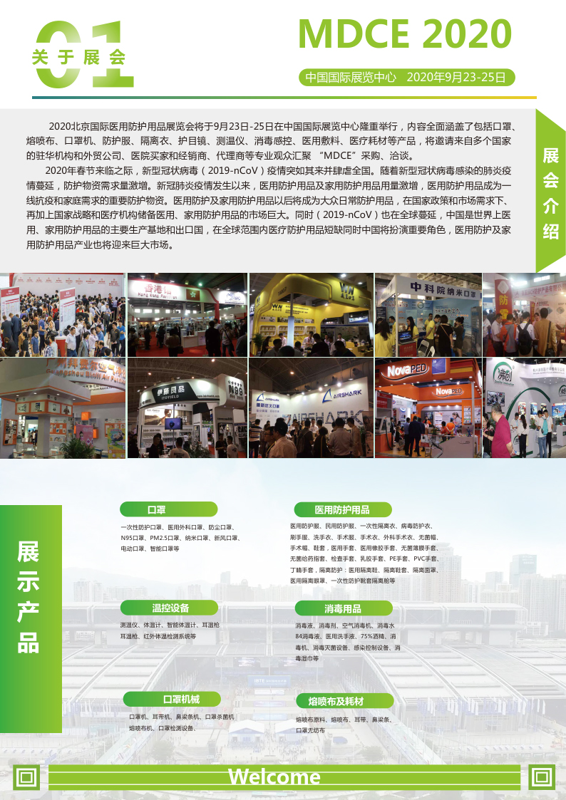展会产品涉及:医用/民用口罩、口罩机、熔喷布、熔喷布机、防护服、隔离衣、测温仪、消毒用品、面罩、护目镜、新冠检测等防疫物资产品