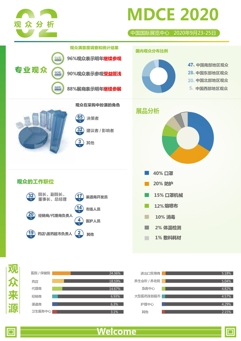 观众简介:来自经销商、代理商、渠道商、进出口贸易商、医院、药店、社区卫生服务中心、大型医药连锁超市、驻华使馆/商务参赞处、疾控中心、学校、线上经销商等6万多名专业买家莅临参观采购!
