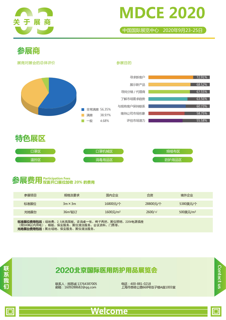 北京国际医用防护用品展览会定于2020年9月23日-9月25日在北京.中国国际展览中心举办,由上海聚亿展览服务有限公司整合资源全力打造的上海首站全国防疫物资展览会:2020上海国际防疫物资用品展览会已于2020年7月3日落下帷幕,展会来自全球4万多名专业买家,1050个品牌,设立展位1800多个,展览面积4100平方米,为防疫物资年度盛会。本次展会产品涉及:医用/民用口罩、口罩机、熔喷布、熔喷布机、防护服、隔离衣、测温仪、消毒感控、面罩、护目镜、敷料、耗材等防疫物资产品, 届时,业内近千家知名公司纷纷在本次展会上亮相,敬请期待,诚邀业内各相关单位莅临参与指导!