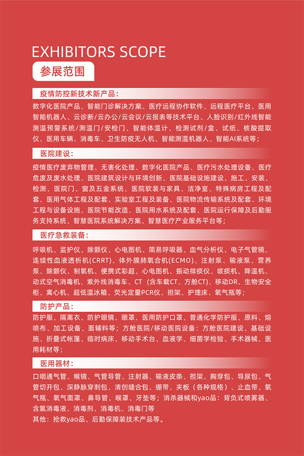 疫情医疗废弃物管理、无害化处理、数字化医院产品、医疗污水处理设备、医疗危废及废水处理、医院建筑设计与环境创新、医院基础设施建设、施工、安装、检测、医院门、窗及五金系统、医院软装与家具、洁净室、特殊病房工程及配套、医用气体工程及配套、实验室工程及装备、医院物流传输系统及配套、环境工程与设备设施、医院节能改造、医院用水系统及配套、医院运行保障及后勤服务支持系统、智慧医院系统解决方案、智慧医疗产业服务平台等;