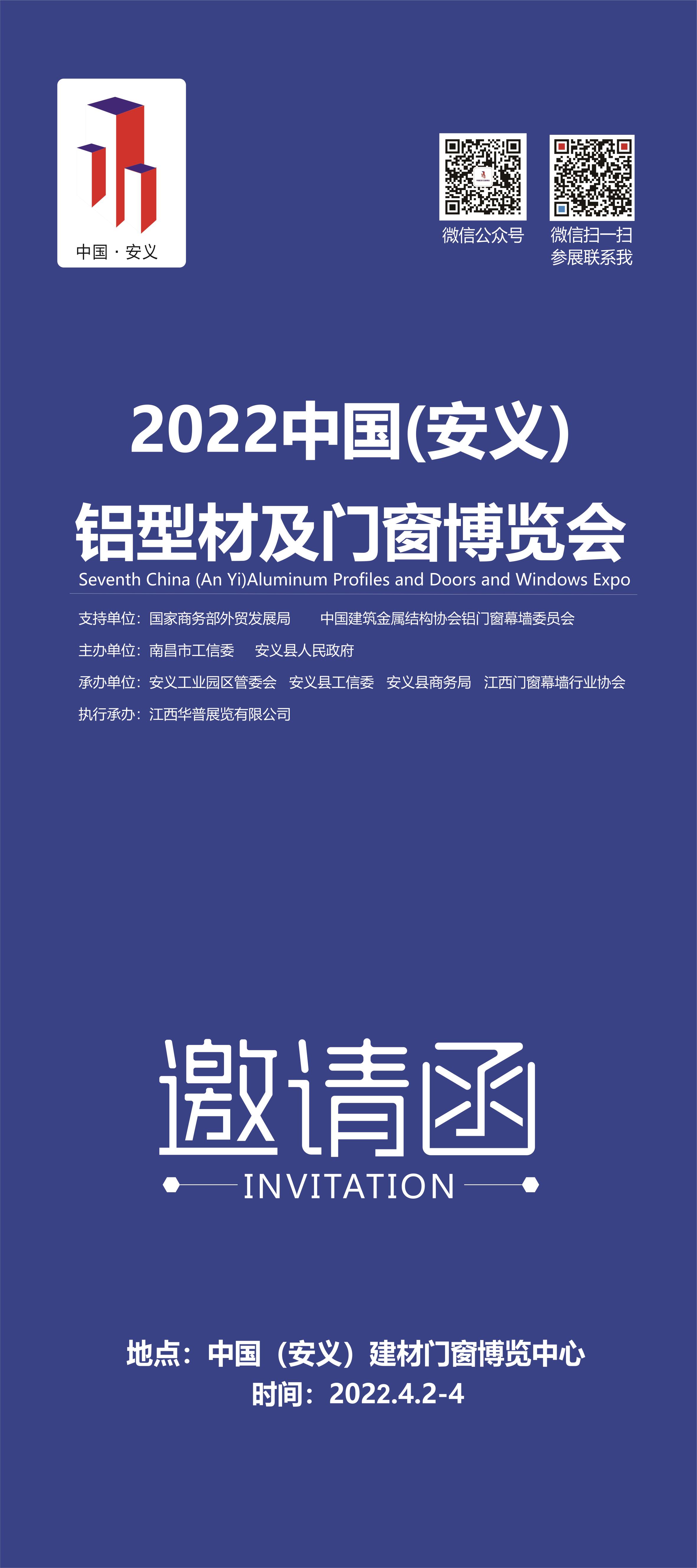 2022中国(安义)铝型材及门窗博览会以“中国门窗•安义制造”为主题,以“促进转变发展方式、推广应用科技成果、拓展扩大经贸交流”为宗旨,遵循“立足创新、突出特色、提升档次、扩大影响”的思路,将展会打造成为“有档次、有影响、有效果”的专业铝型材及门窗博览会。