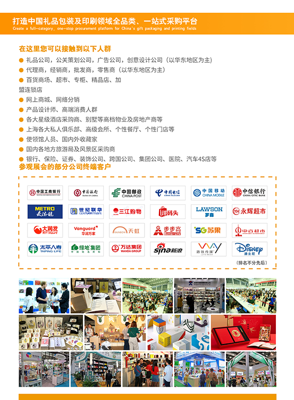 本次展会作为全球领先的礼品包装行业贸易平台,展会面积将达10,000多平方米,汇聚国内外知名供应商及高质量购买力的专业采购商,倾力打造全球礼品包装行业的瞩目盛事。与2021第19届上海礼品展同期举行,吸引力势必大增。两个相关行业盛会将产生协同效应,吸引更多国际买家到场参观,其中不少是同时采购礼品和包装盒制品的买家。