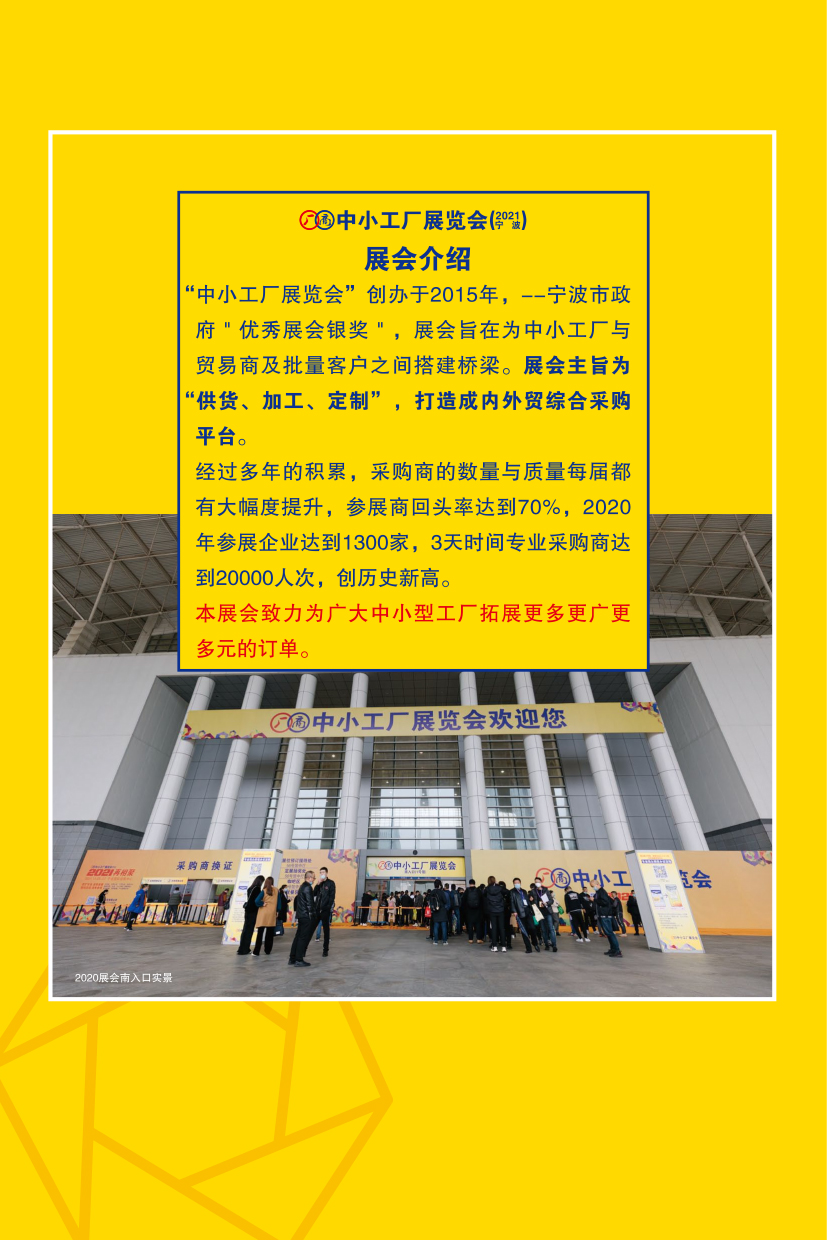 中小工厂展为外贸工厂与外贸机构之间搭建桥梁起到良好作用,平均每届吸引超过10000名专业观众及买家到场参观采购。自2014年12月起为适应产业发展趋势;顺应众多参展商增加国内客户订单需求;也同时满足大量国内商家寻求货源,寻求加工订制工厂需求,本展会自2014年12月一届起更名为:“中小型工厂展览会”,展会主旨为“打样、加工、定制、供货”。展会致力于为广大中小型工厂拓展更多元化的订单,帮助客商寻求优质货源。