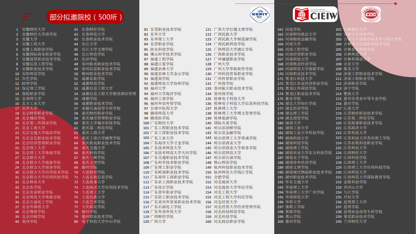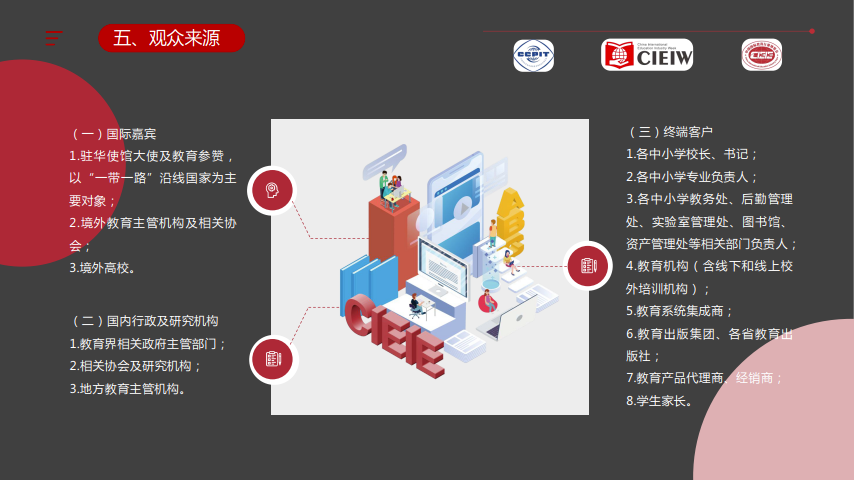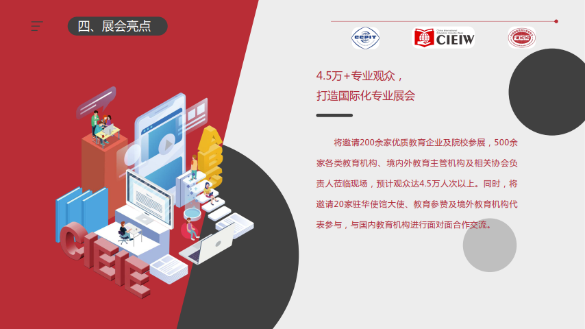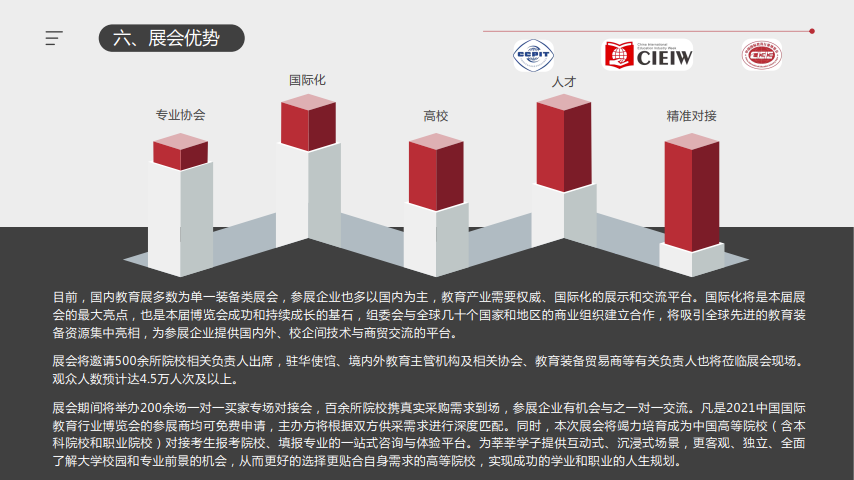2021中国国际教育行业博览会将邀请500余所高校相关负责人出席,驻华使馆、境内外教育主管机构及相关协会、教育装备贸易商等有关负责人也将莅临展会现场,预计参展企业300家,观众人数4.5万人次及以上。
