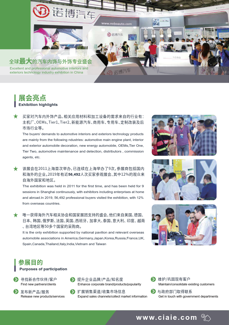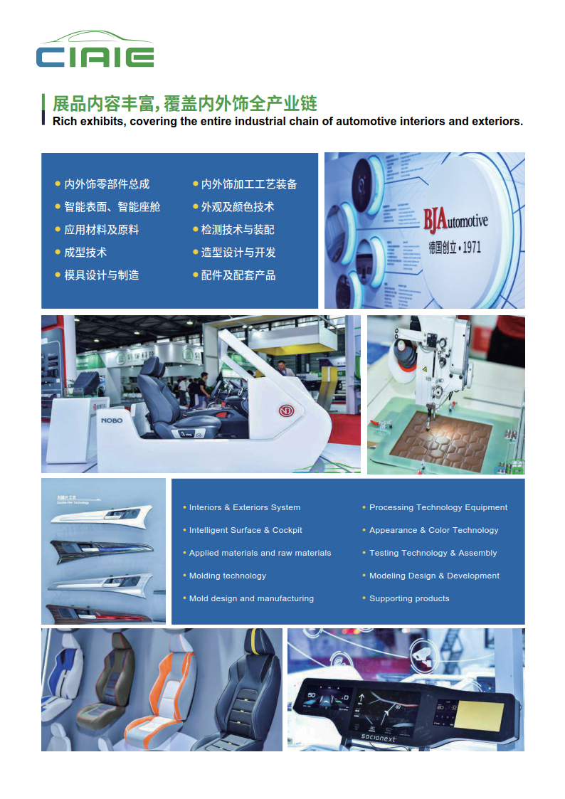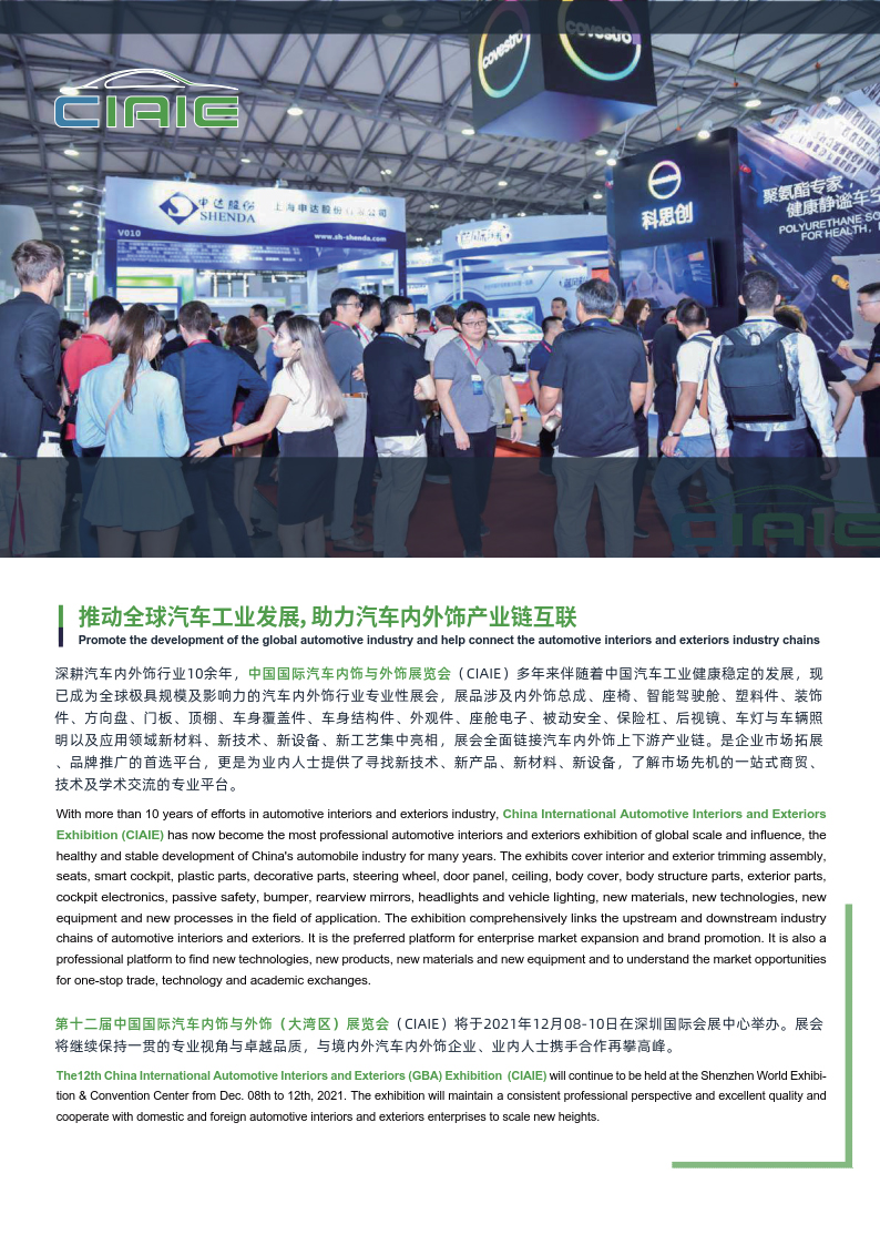 深耕汽车内外饰行业10余年,中国国际汽车内饰与外饰展览会(CIAIE)多年来伴随着中国汽车工业健康稳定的发展,现已成为全球极具规模及影响力的汽车内外饰行业专业性展会,展品涉及内外饰总成、座椅、智能驾驶舱、塑料件、装饰件、方向盘、门板、顶棚、车身覆盖件、车身结构件、外观件、座舱电子、被动安全、保险杠、后视镜、车灯与车辆照明以及应用领域新材料、新技术、新设备、新工艺集中亮相, 展会全面链接汽车内外饰上下游产业链。是企业市场拓展、品牌推广的选择平台, 更是为业内人士提供了寻找新技术、新产品、新材料、新设备,了解市场先机的一站式商贸、 技术及学术交流的专业平台。