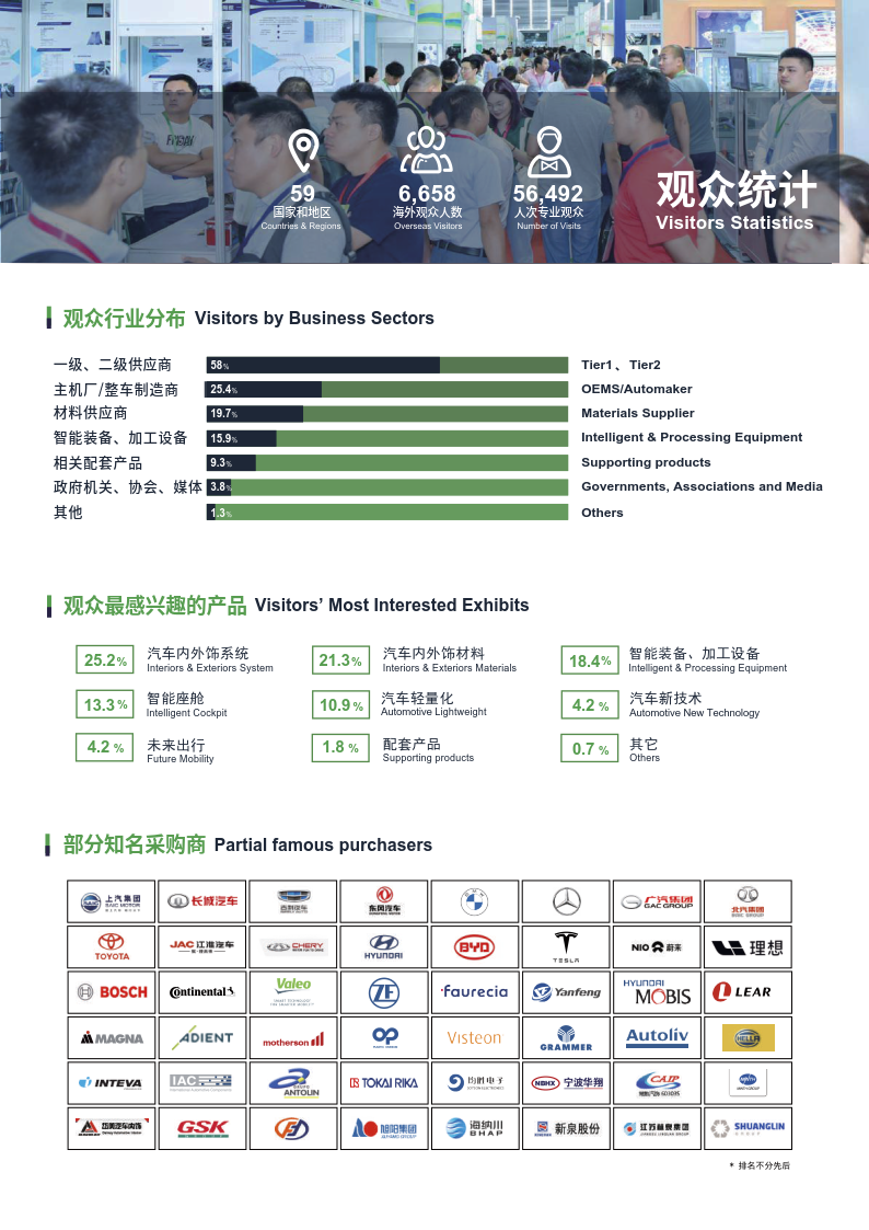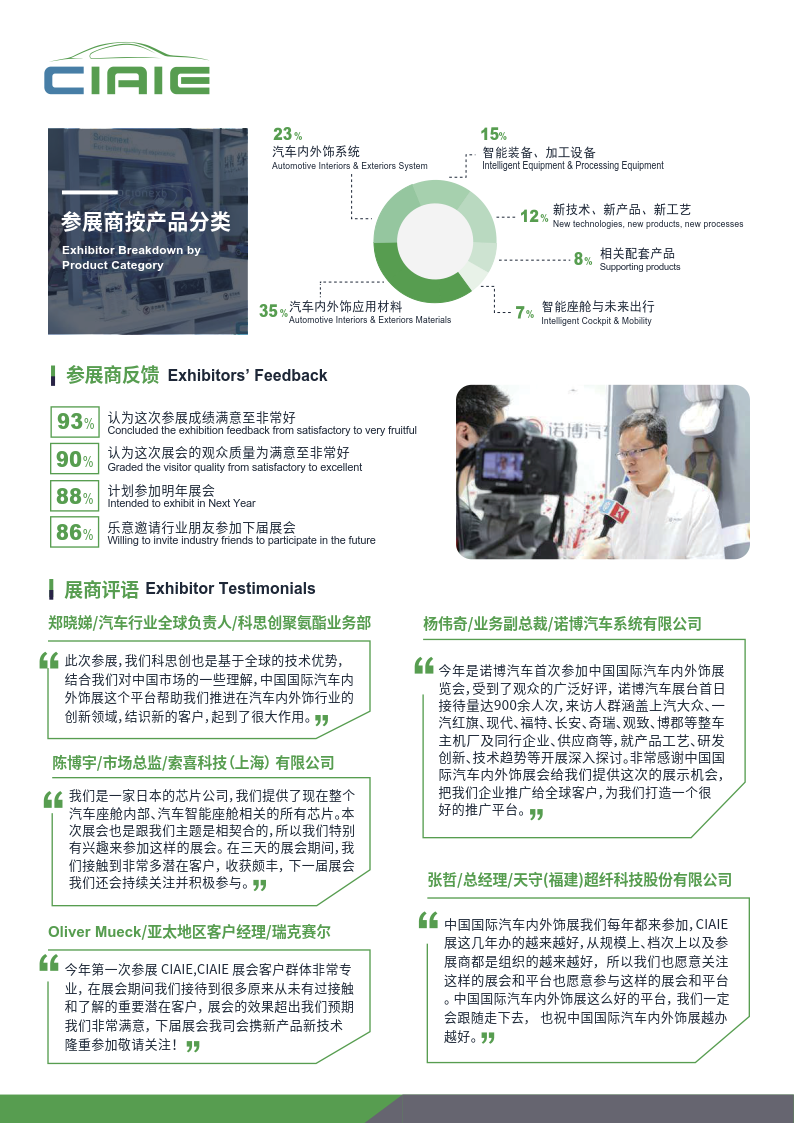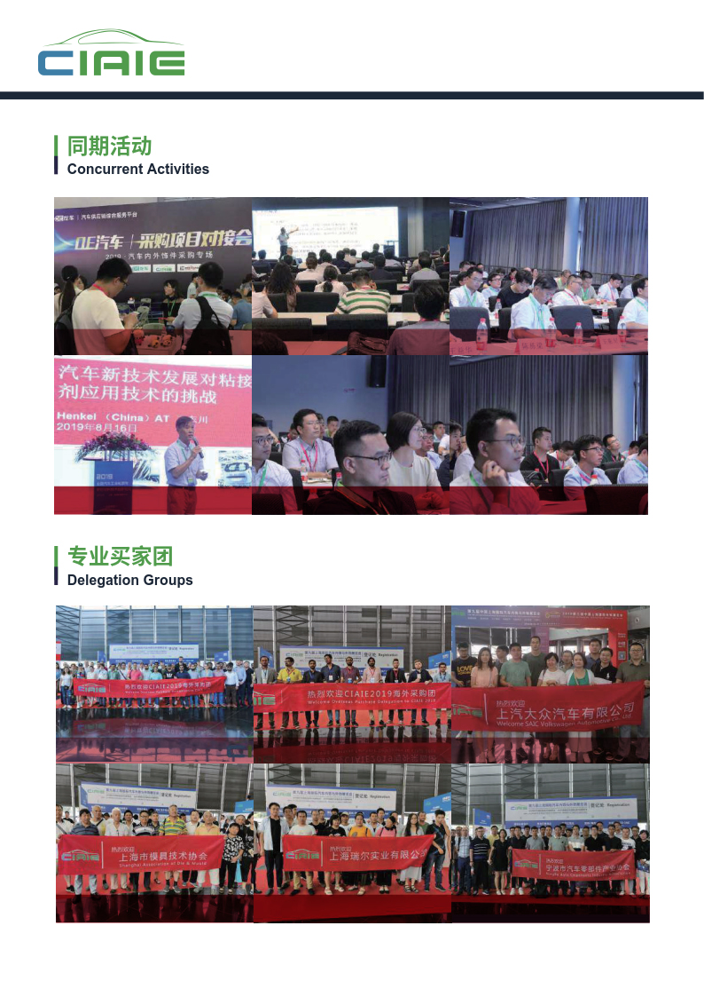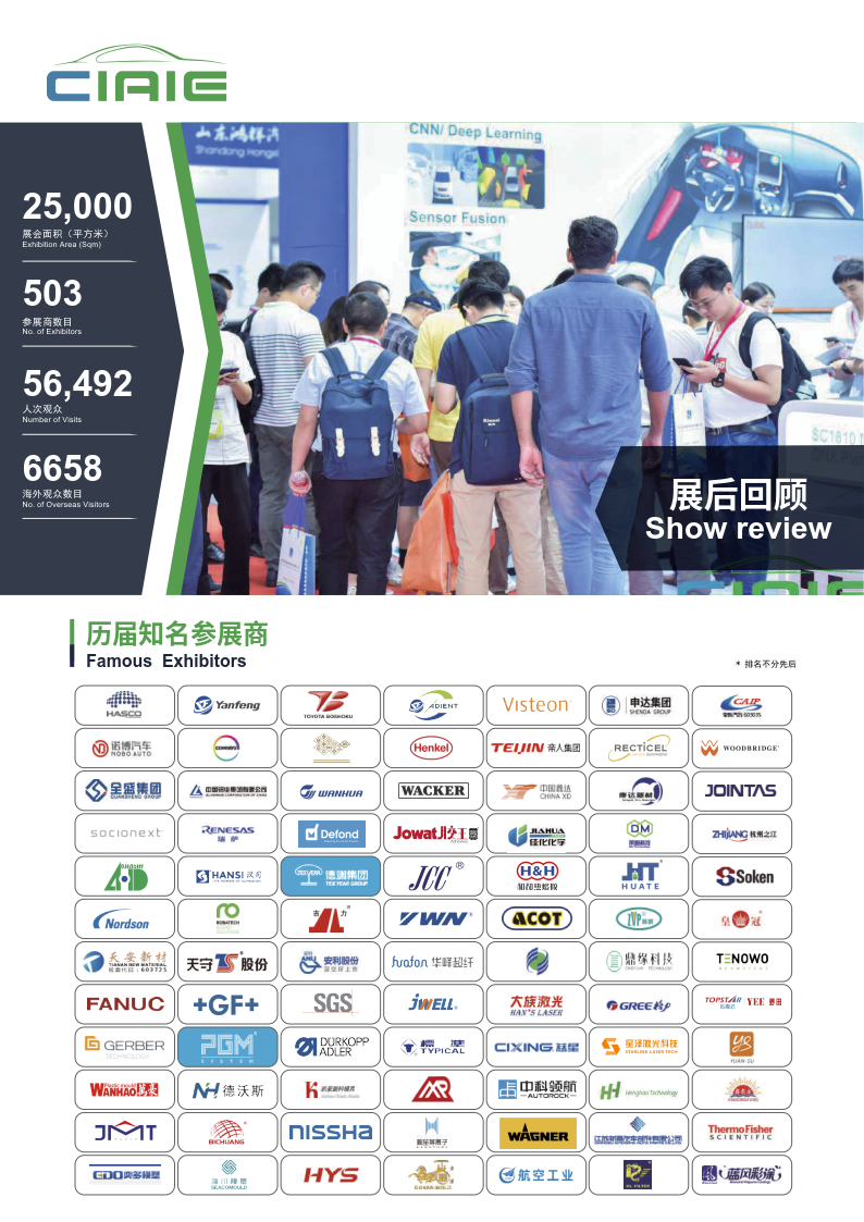 深耕汽车内外饰行业10余年,中国国际汽车内饰与外饰展览会(CIAIE)多年来伴随着中国汽车工业健康稳定的发展,现已成为全球极具规模及影响力的汽车内外饰行业专业性展会,展品涉及内外饰总成、座椅、智能驾驶舱、塑料件、装饰件、方向盘、门板、顶棚、车身覆盖件、车身结构件、外观件、座舱电子、被动安全、保险杠、后视镜、车灯与车辆照明以及应用领域新材料、新技术、新设备、新工艺集中亮相, 展会全面链接汽车内外饰上下游产业链。是企业市场拓展、品牌推广的选择平台, 更是为业内人士提供了寻找新技术、新产品、新材料、新设备,了解市场先机的一站式商贸、 技术及学术交流的专业平台。