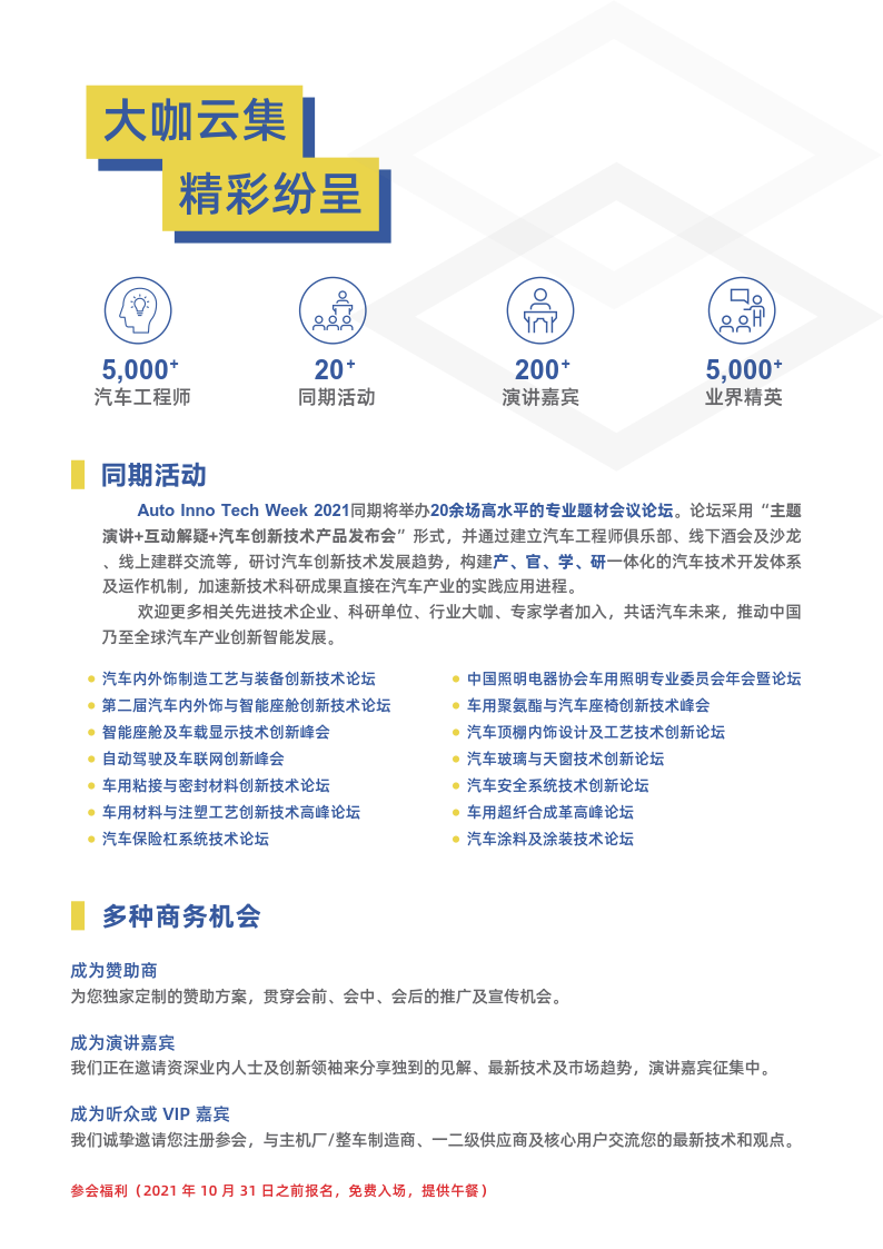 作为2021大湾区国际汽车创新技术周具影响力品牌活动,CIAIE 2021将设1个主会场+10个分会场的展现模式,展示时代变革下的新产品、新工艺、新材料、新技术、新装备,与汽车主机厂、供应商等品牌企业,共同交流探讨时代变革下的新思路、新行情,新机遇。