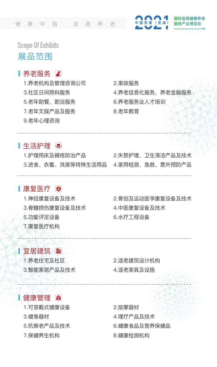 2021芜湖老博会坚持创新求索,从政策,科技,产业等多维度引入资源,以推动经济结构转型升级,满足人民群众多层次,多样化的养老服务和康复辅具需求,促进养老产业,康复辅具产业高质量发展为服务目标,打造更优更强的安徽老博会。