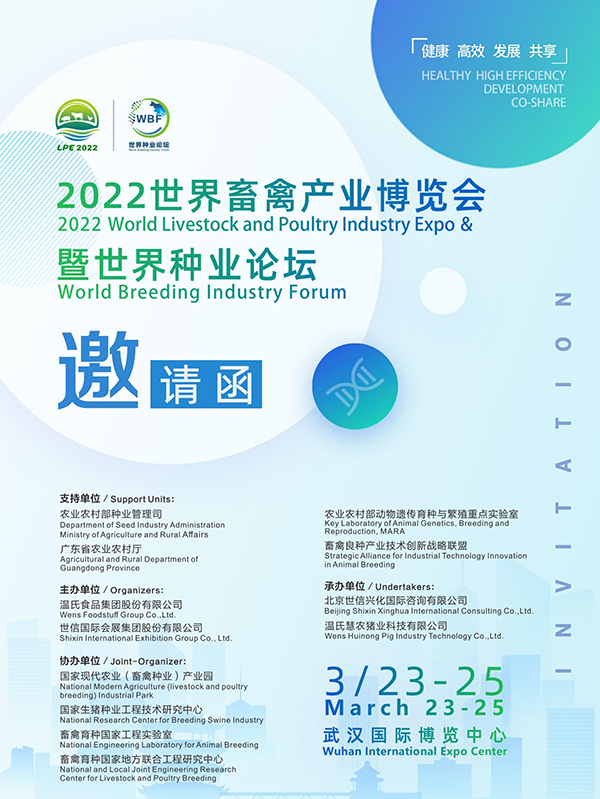 2022世界畜禽产业博览会将于3月23-25日在武汉国际博览中心隆重召开。本届博览会将以湖北为中心,依托湖南、河南、山东、安徽、河北等我国畜牧业大省,打造全球畜禽产业科技交流与合作平台。本届博览会展示面积6万平米,专业观众预计达到10万人次。