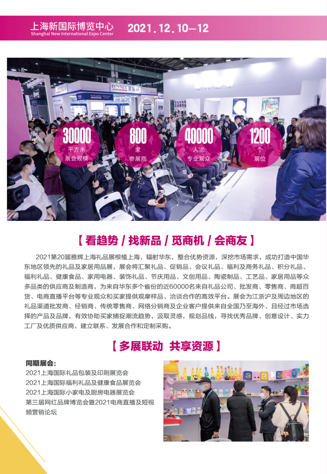 欢迎参加2021第20届上海国际礼品、赠品及家居用品展览会(简称:上海礼品展),上海礼品展根植上海,辐射华东,整合优势资源,深挖市场需求,成功打造中国华东地区领先的礼品、促销品、家居用品展。