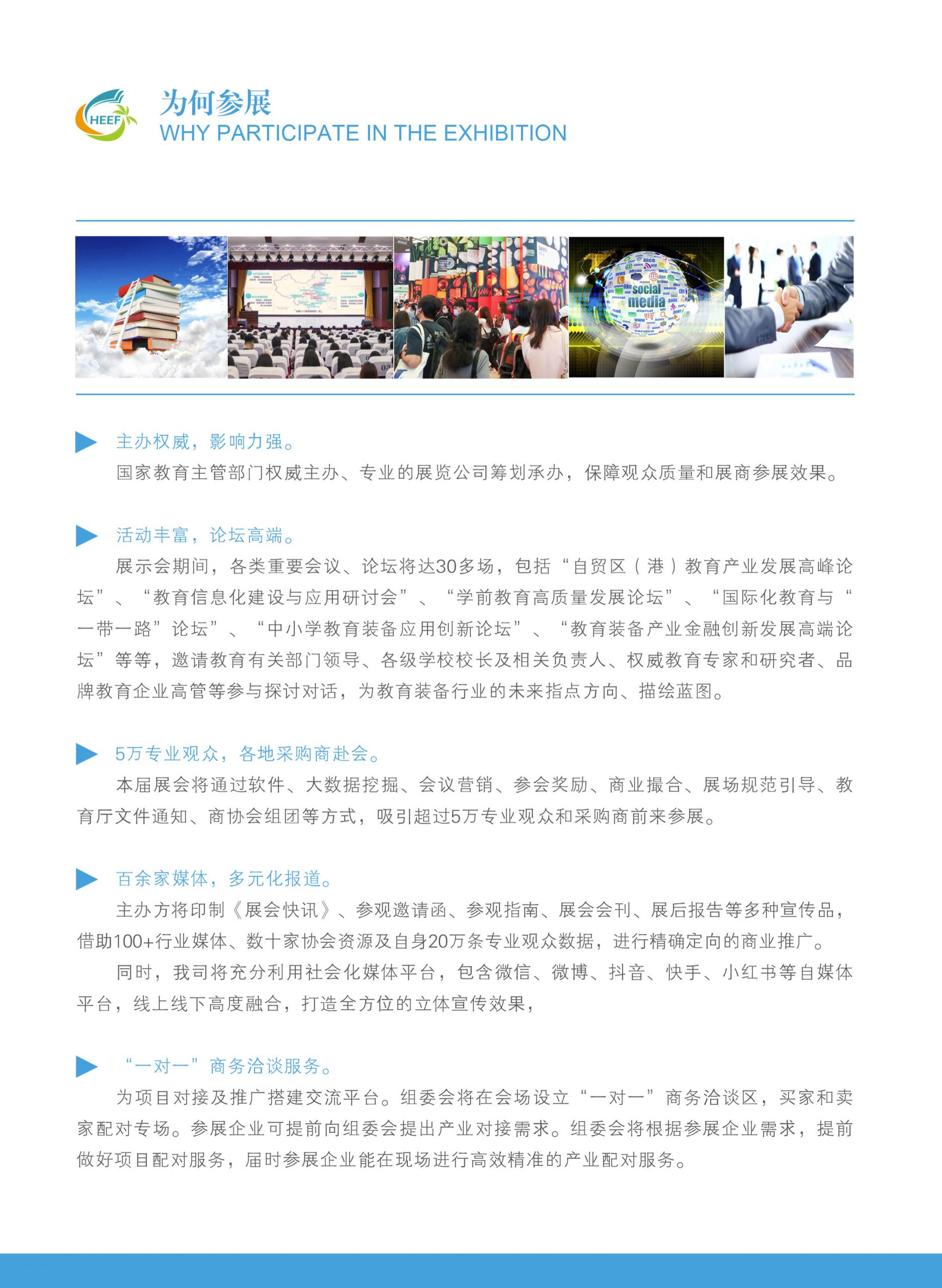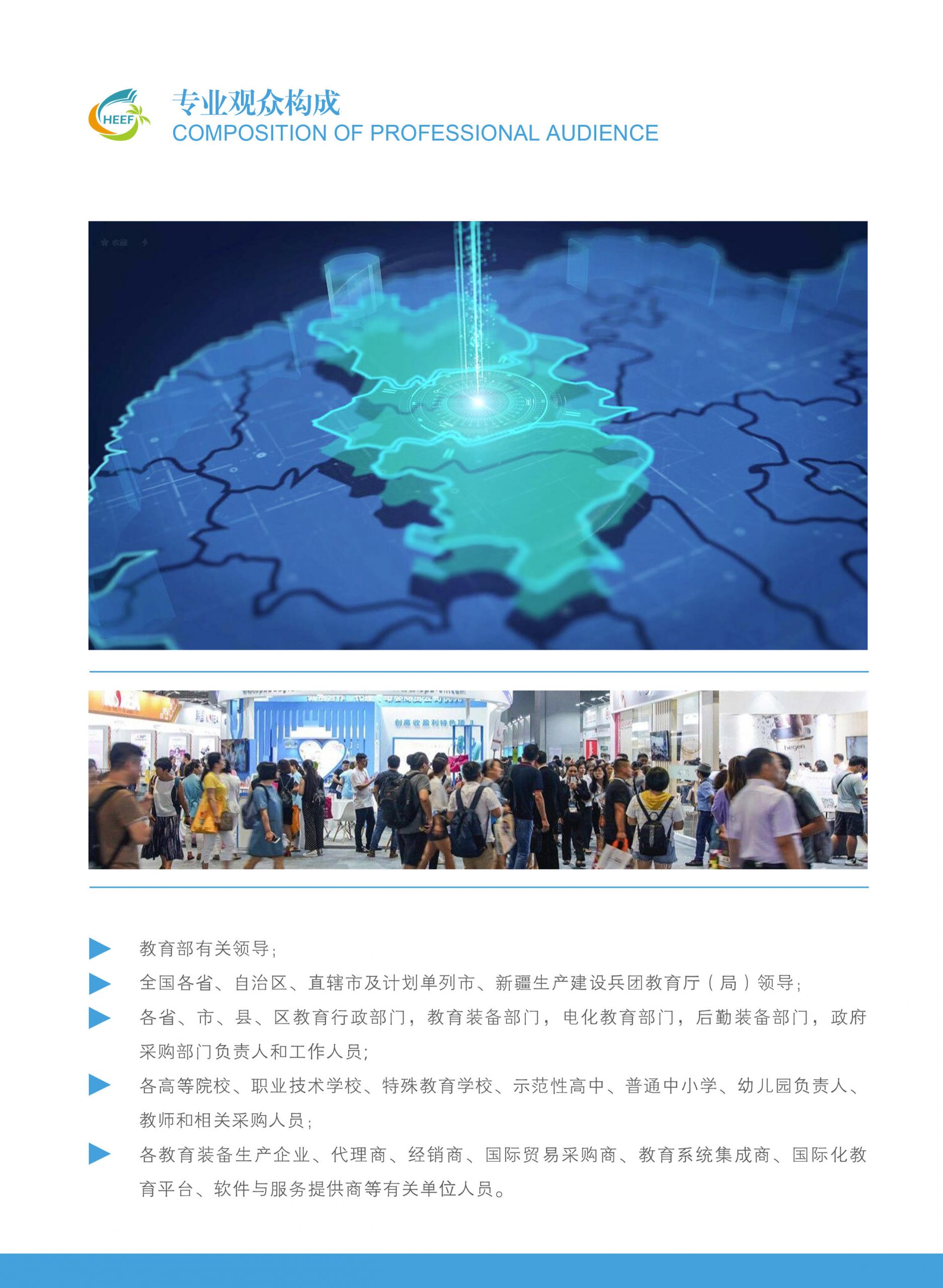 展示各级各类教育所需的教学仪器设备、实验室及功能教室设备、试剂耗材、职教实训、地理园、生态园、数字化校园建设、电化教育设备、课堂教育资源、创客教育、机器人、VR技术、校园网路系统建设、信息中心建设、数字化校园应用服务平台建设、电子书包、学前教育装备、益智玩具、户外设施、室内玩具、娱乐玩具、自制玩具、教学用音乐、美术、图书及体育设施、后勤设施装备、校用办公、校车、校服、校园灯光设施、安全及消防器材、厨房设备、生活用具、学生用品、环保节水设备等;