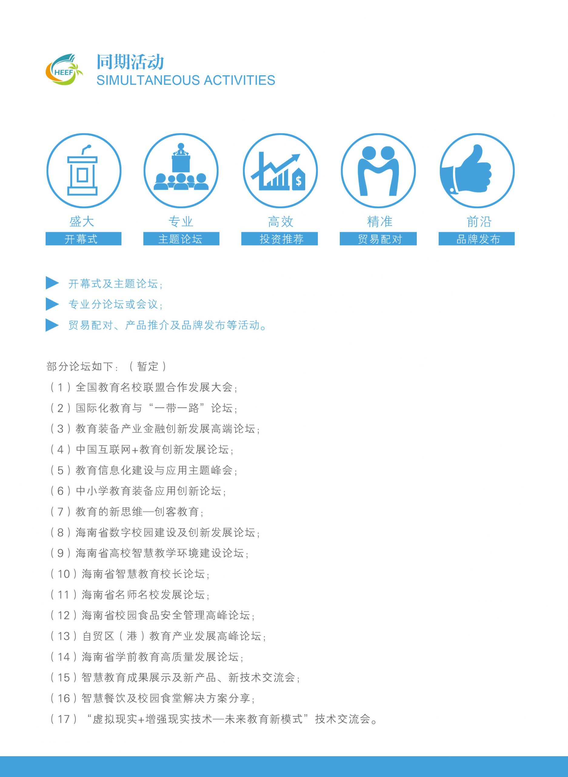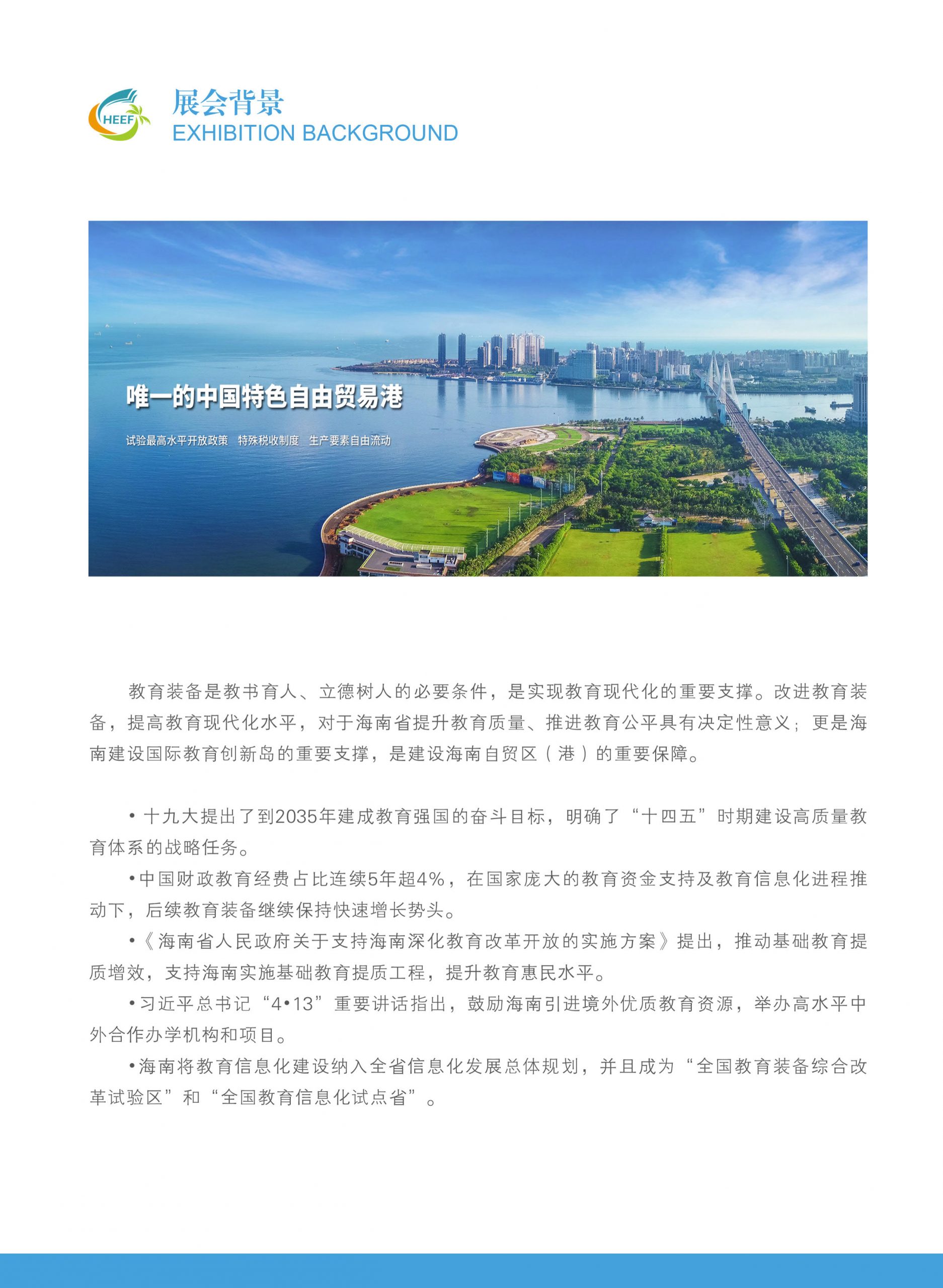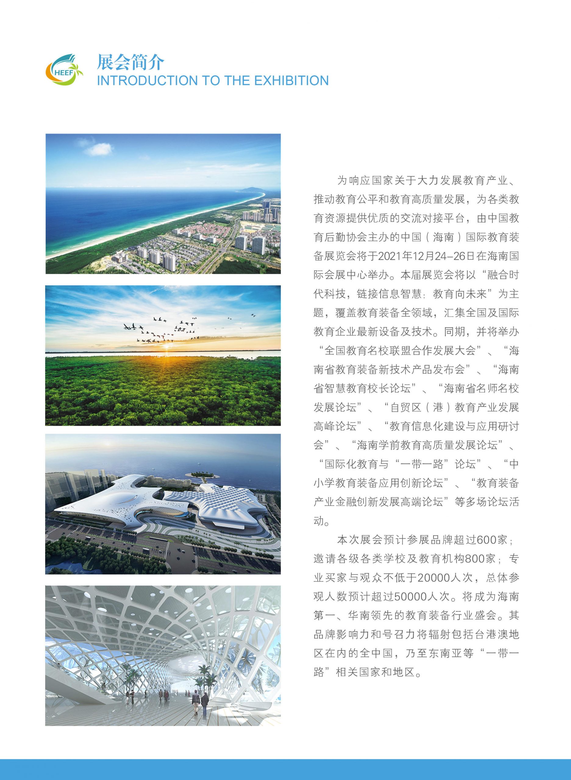 为响应国家关于大力发展教育产业、推动教育公平和教育高质量发展,为各类教育资源提供优质的交流对接平台,由中国教育后勤协会主办的中国(海南)国际教育装备展览会将于2021年12月24-26日在海南国际中心举办。本届展览会将以“融合时代科技,链接信息智慧:教育向未来”为主题,覆盖教育装备全领域,汇集全国及国际教育企业最新设备及技术。同期,并将举办“全国教育名校联盟合作发展大会”、“海南省教育装备新技术产品发布会”、“海南省智慧教育校长论坛”、“海南省名师名校发展论坛”、“自贸区(港)教育产业发展高峰论坛”、“教育信息化建设与应用研讨会”、“海南学前教育高质量发展论坛”、“国际化教育与“一带一路”论坛”、“中小学教育装备应用创新论坛”、“教育装备产业金融创新发展高端论坛”等多场论坛活动。