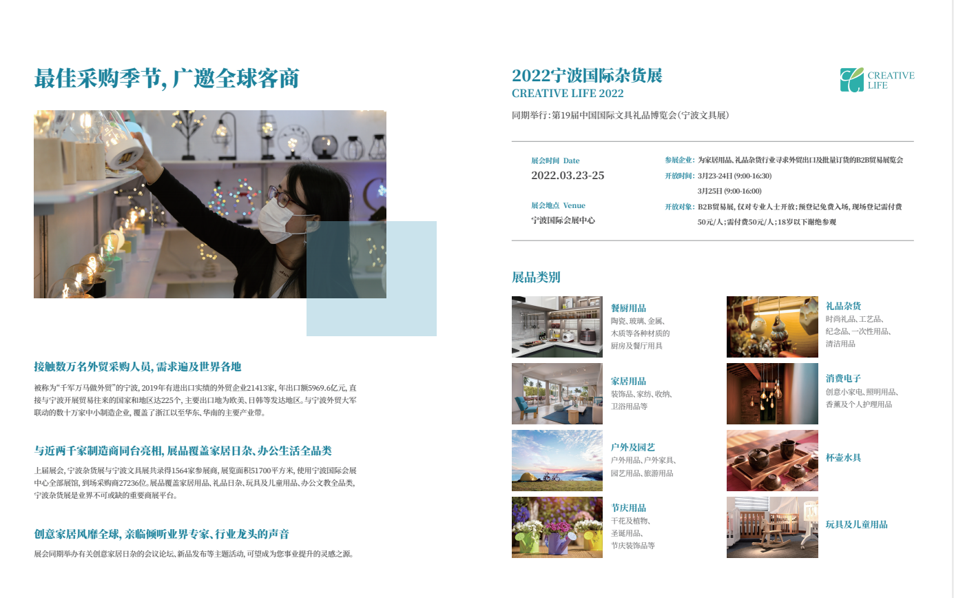 内容摘要: 精致杂货,缤纷生活 CREATIVE LIFE 2022宁波国际杂货展 2022宁波杂货展|生活用品展|日用百货展|礼品家居展 展览时间:2022年3月23-25日 展览地点:宁波国际会展中心 展会规模:10000平方米;……