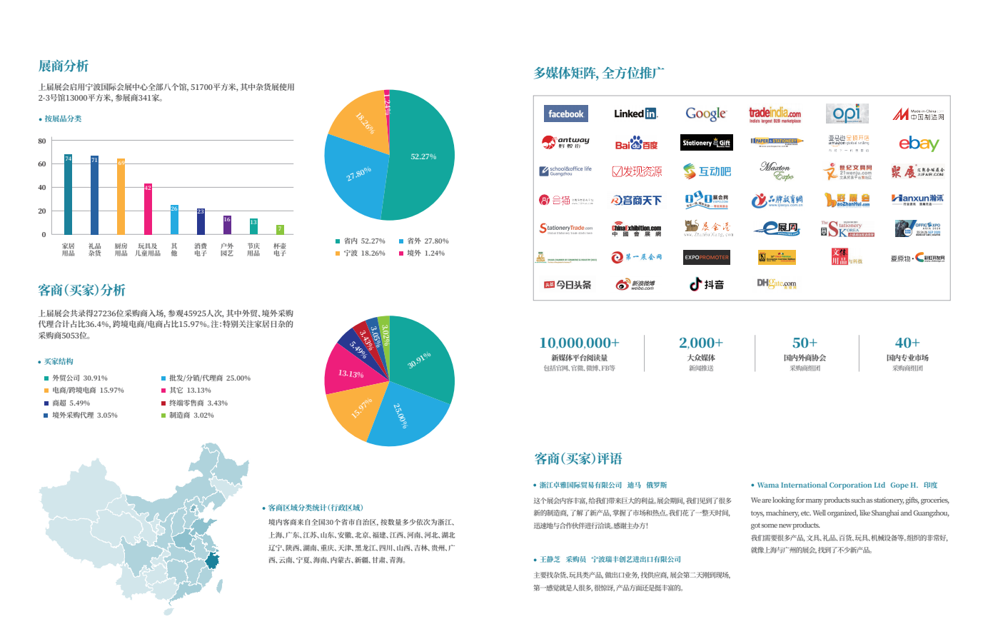 双展同开,将共同启用宁波国际会展中心全部八个展馆,展览面积达51700平方米,预计参展商1800+家,入场客商30000+人,总参观人数达40000+人次。宁波杂货展