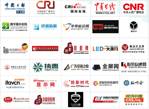 合作媒体:数字展示在线、影像骑士、中国投影网、中国视听网、数字标牌网、音响网、ARinChina、93913虚拟现实、VR陀螺