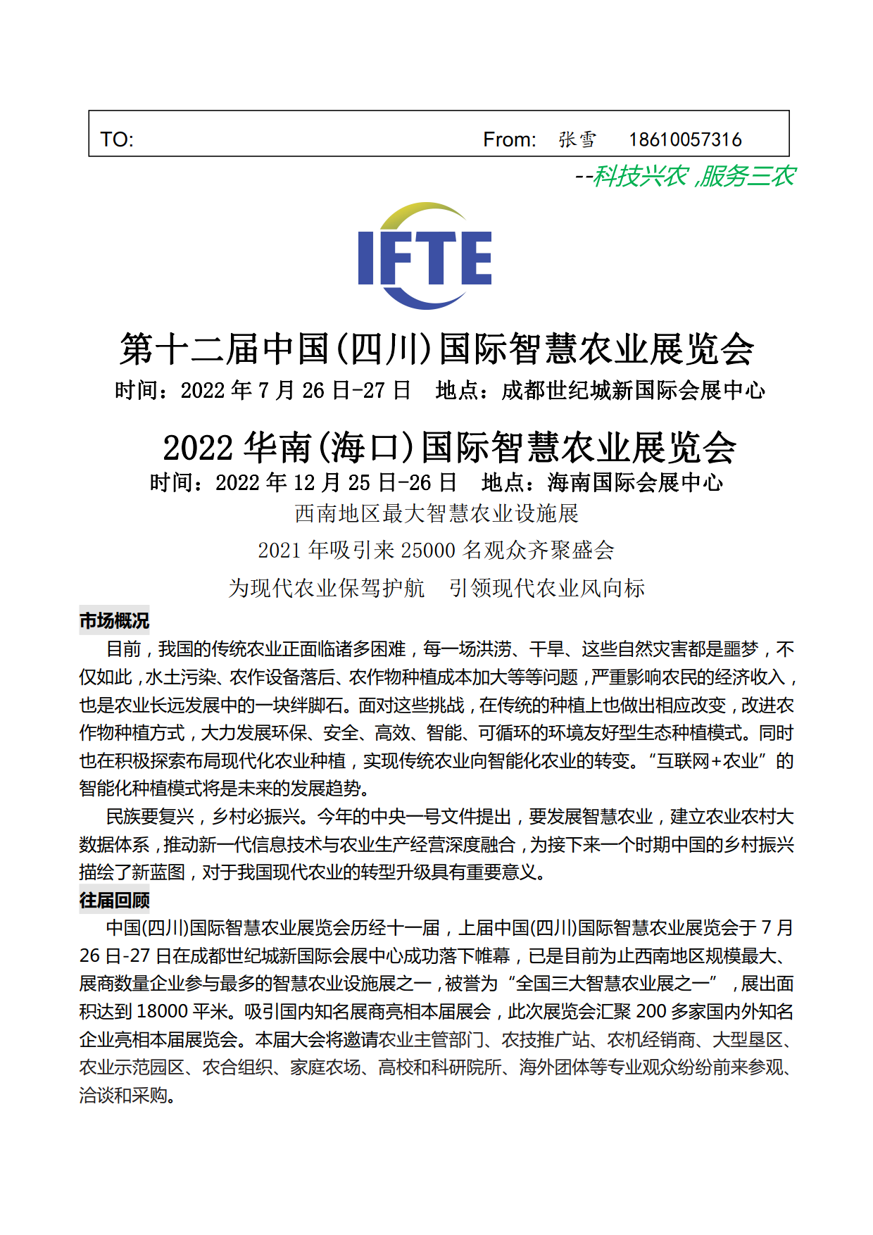 内容摘要: 中国(四川)国际智慧农业展览会历经十一届,上届中国(四川)国际智慧农业展览会于7月26日-27日在成都世纪城新国际会展中心成功落下帷幕,已是目前为止西南地区规模最大、 展商数量企……