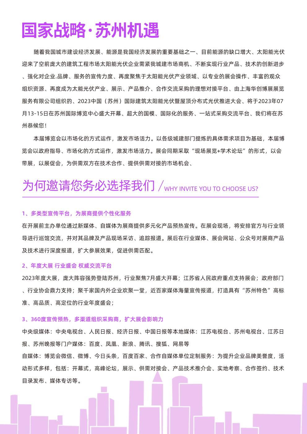 随着我国城市建设经济发展、能源是我国经济发展的重要基础之一、目前能源的缺口增大、太阳能光伏迎来了空前庞大的建筑工程市场太阳能光伏企业需紧我城建市场商机、不断实现行业产品、技术的创新进步、强化对企业.品牌、服务的宣传力度、再度聚焦于太阳能光伏产业领域、以专业的展会操作、丰富的观众组织资源、再度成为太能光伏产业、展示、产品推介、合作交流采购的理想对接平台、由上海华创博展展览服务有限公司组织的、2023中国(苏州)国际建筑太阳能光伏展将于2023年7月13-15日在苏州国际博览中心盛大开幕、超大的国模、国际化的服务、一站式采购交流平台、我们将在苏州恭候您、