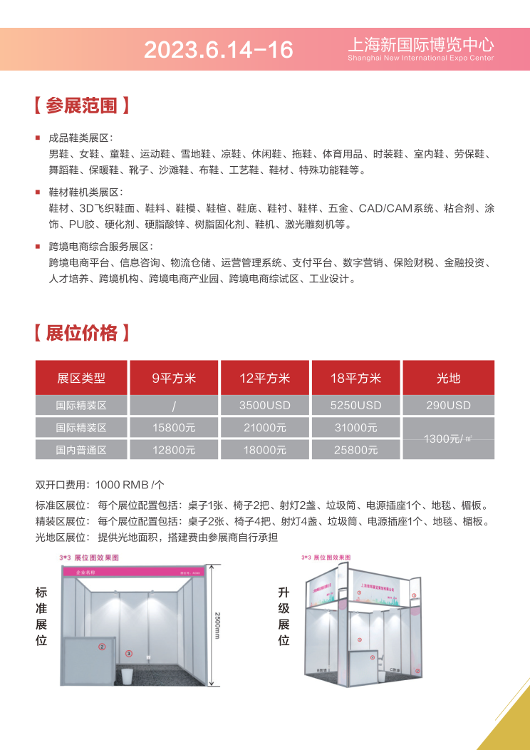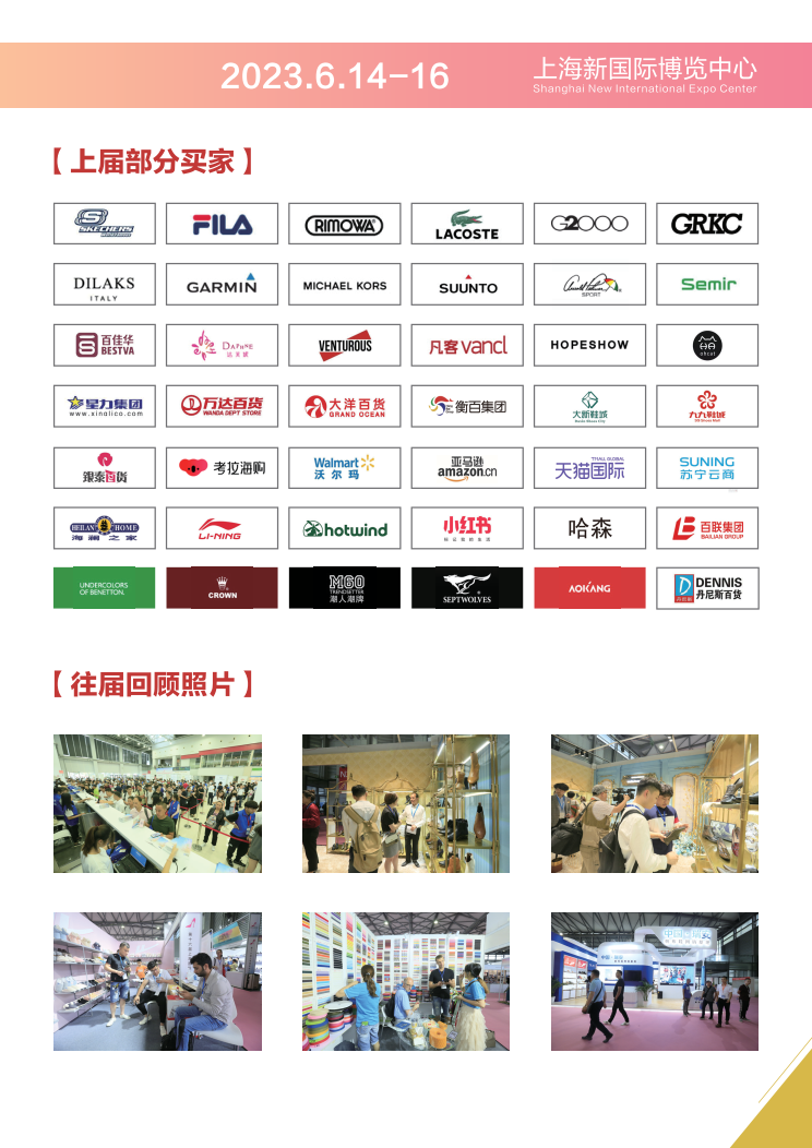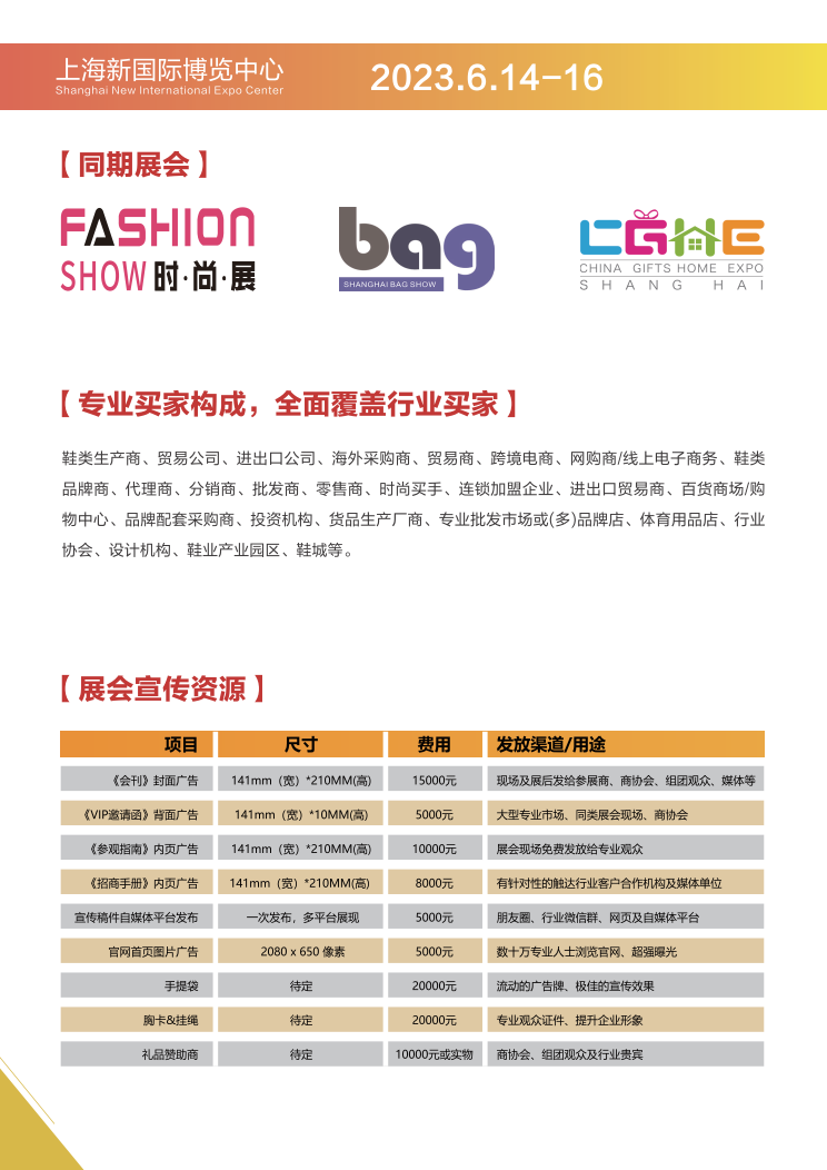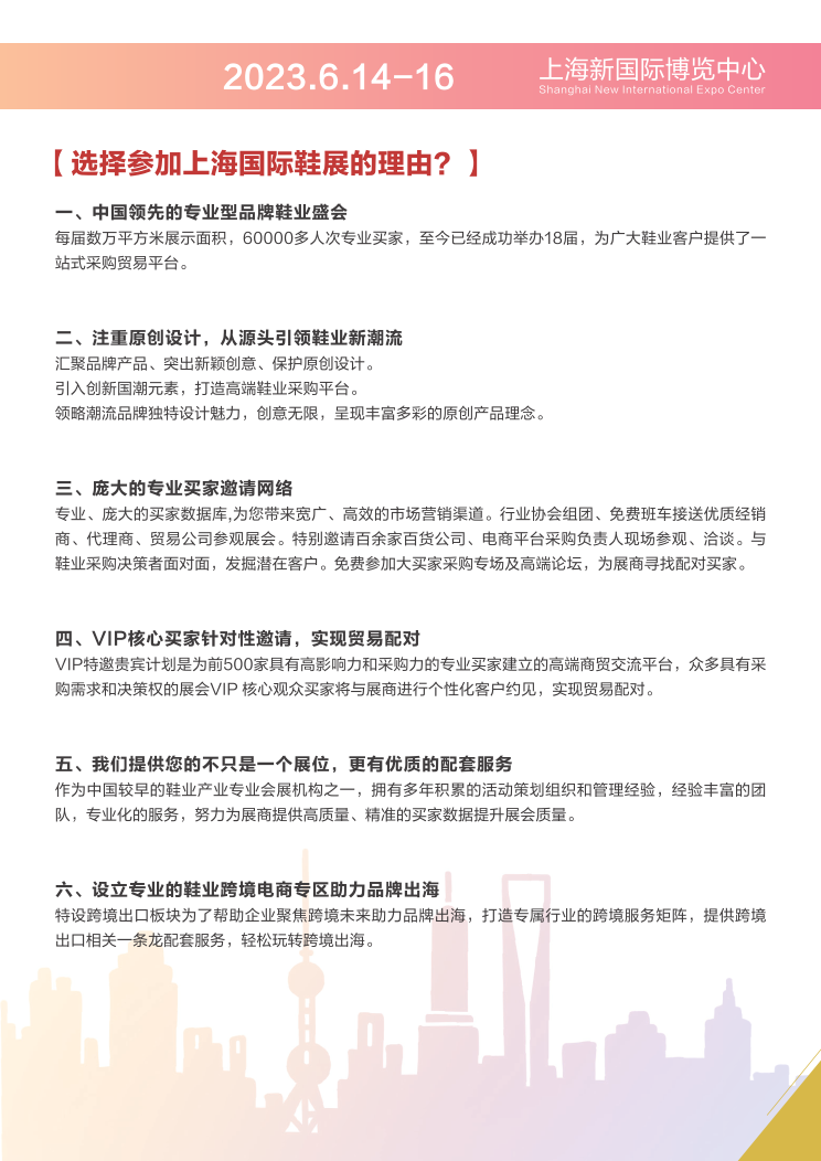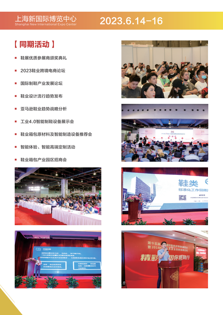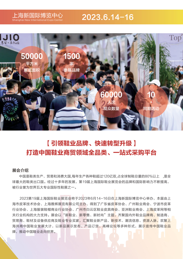 2023第19届上海国际鞋业展览会将于2023年6月14-16日在上海新国际博览中心举办,本届由上海市皮革技术协会、上海雅辉展览有限公司主办、得到了广东省皮革协会、广州鞋业商会、宁波市皮革行业协会、上海服装鞋帽商业行业协会、广州市白云区鞋业皮具商会、亚洲鞋业商会、上海皮革网等相关行业机构的大力支持。展会以“新鞋业、新零售、新时尚”主题,齐聚国内外鞋业品牌商、制造商、贸易商、鞋材及设备供应商及鞋业专业买家,汇聚鞋业新产品、新技术、潮流信息、资源人脉,欢聚上海共商中国鞋业发展大计,以新品展示发布、产品订货、高峰论坛等多种形式,展示宣传中国鞋业品牌,推动中国鞋业走向世界。