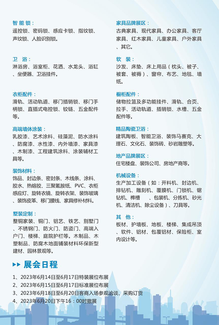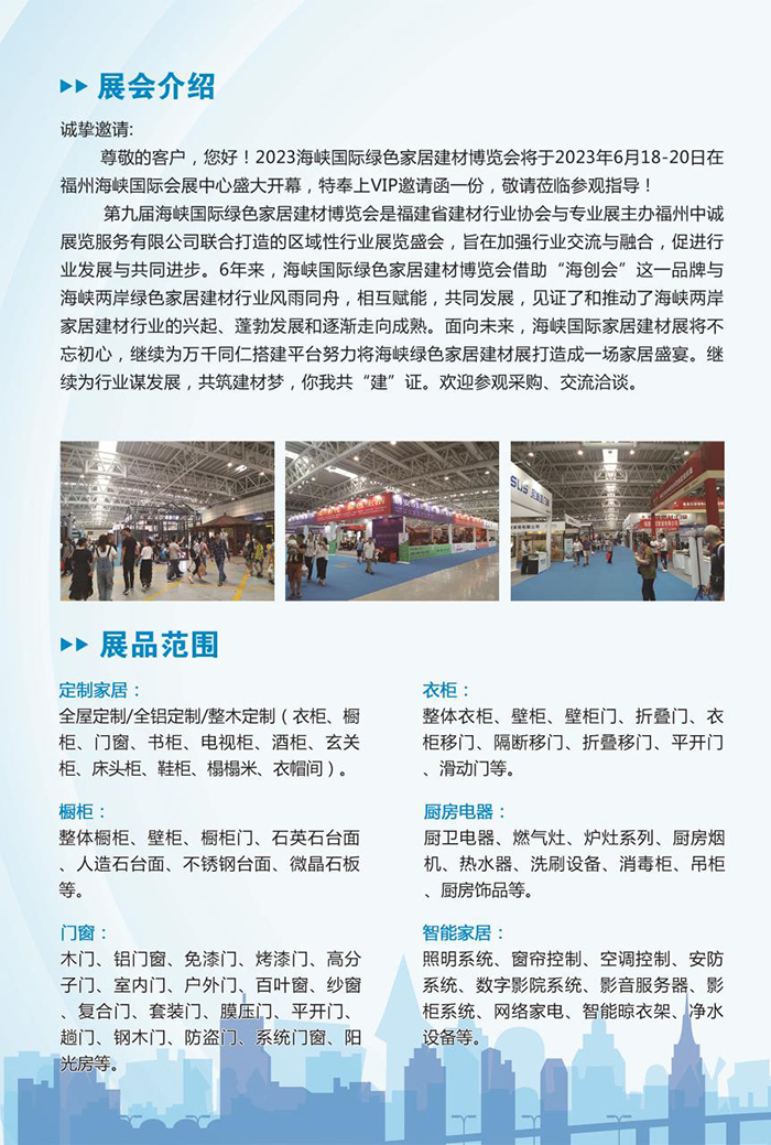 内容摘要: 第九届海峡国际绿色家居建材博览会 第九届中国(福州)系统门窗·全屋定制博览会 时间:2023年6月18-20日 地点:福州海峡国际会展中心 主办单位:福建省建材行业协会 组织单位:福州……