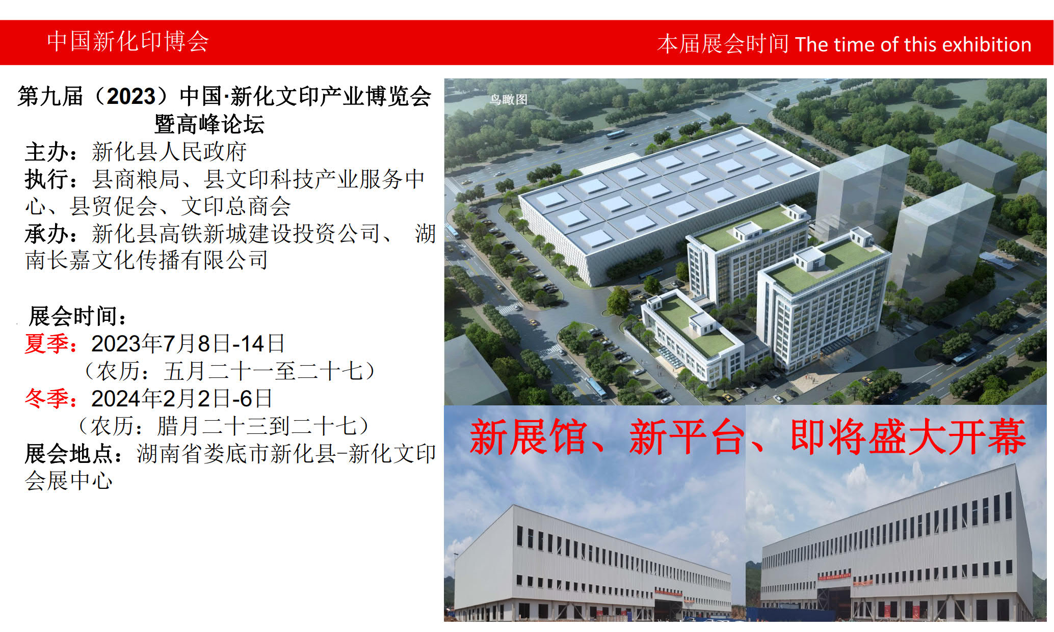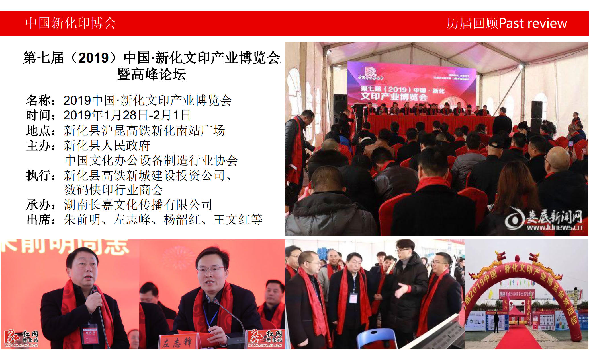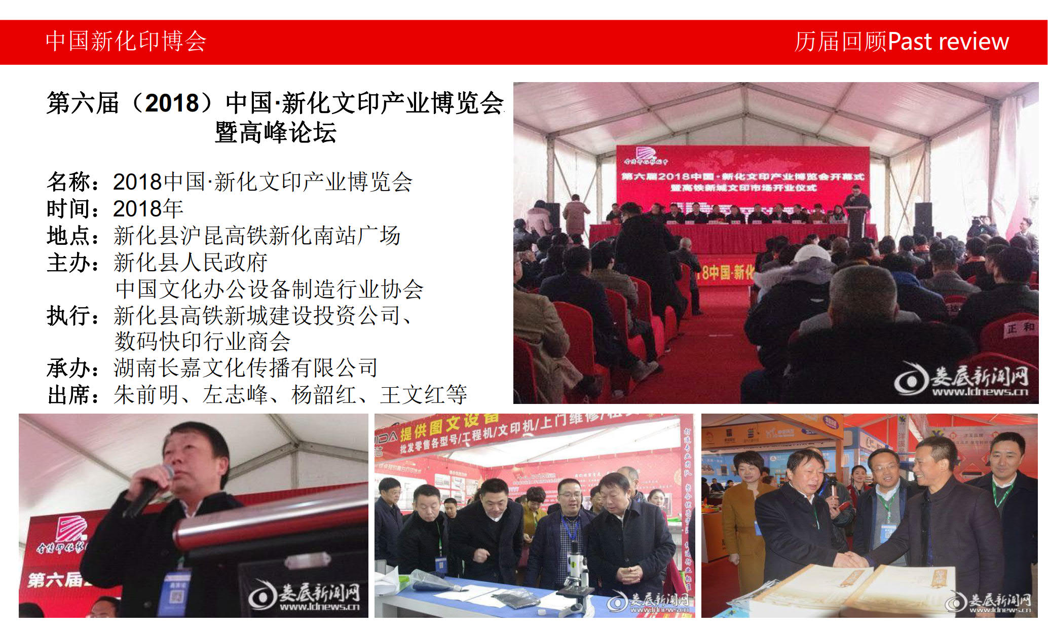 展会举办:中国·新化文印产业博览会简称“中国新化印博会”,由新化县人民政府主办、县商务粮食局主管、新化县高铁新城和县经贸促进会执行,由商务部重点联系的会展企业湖南长嘉文化传播有限公司创办并承办,以“中国新化,文印天下”为主题;为新化文印千亿产业搭建展示、交易、发展、招商引资平台。