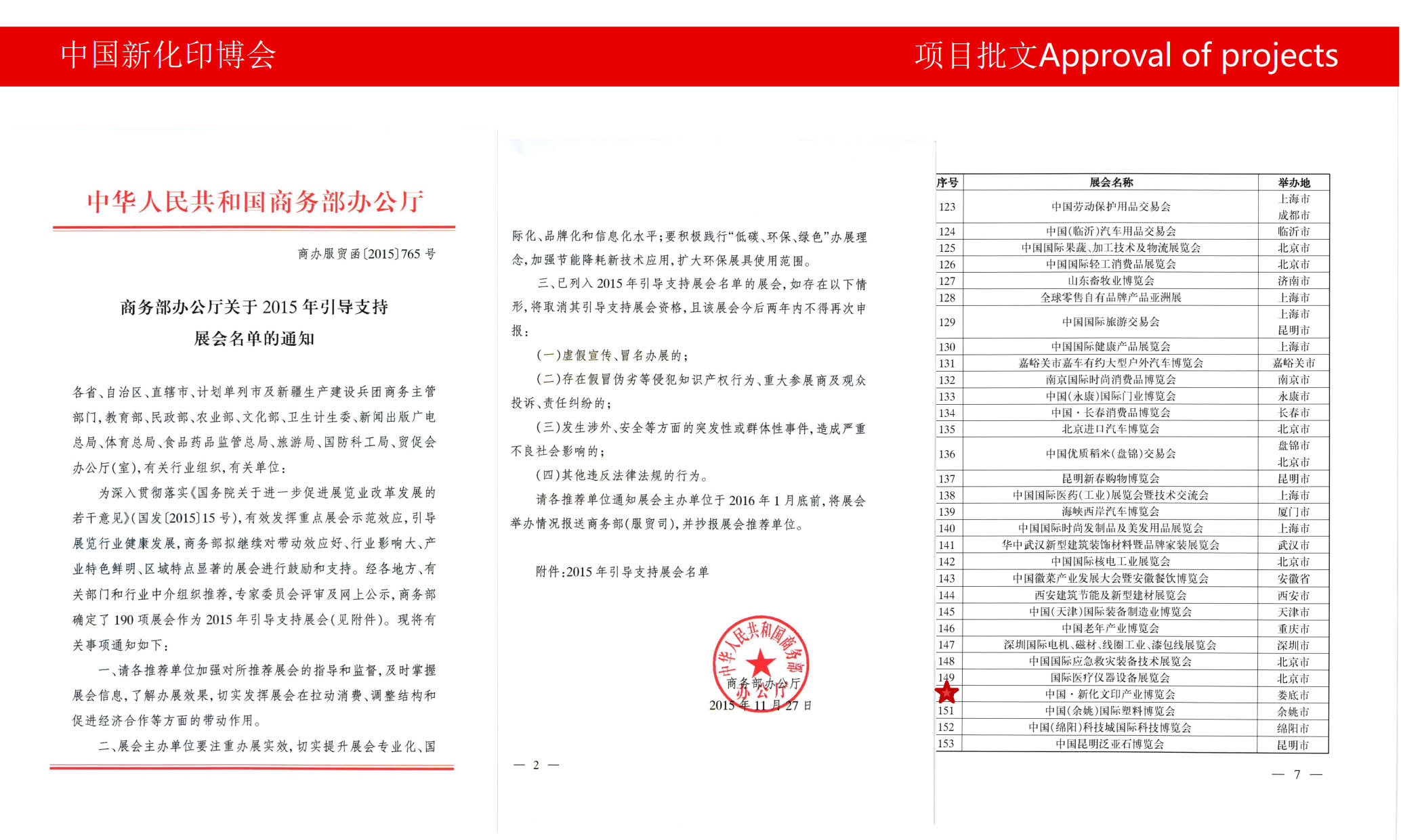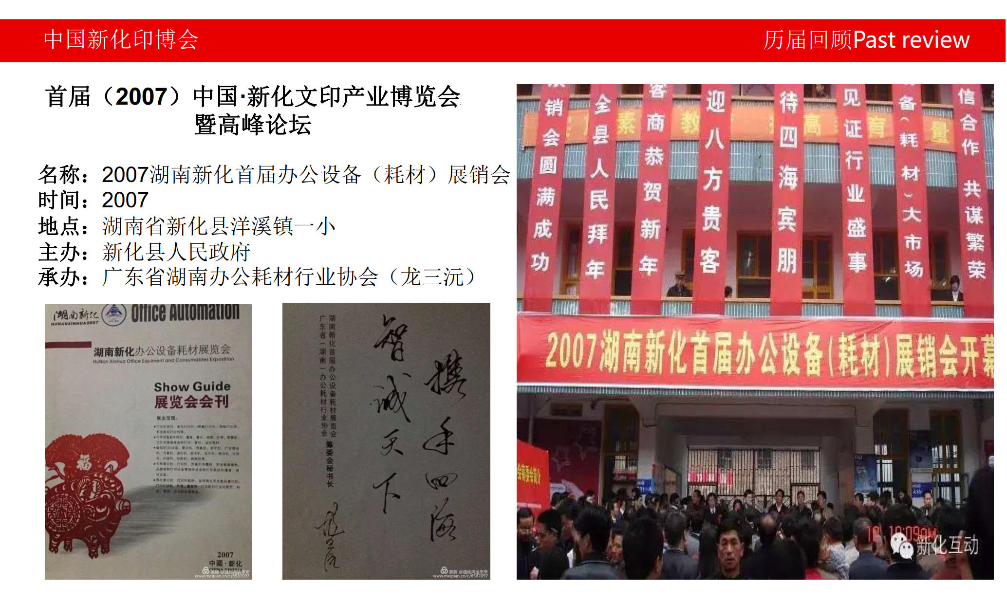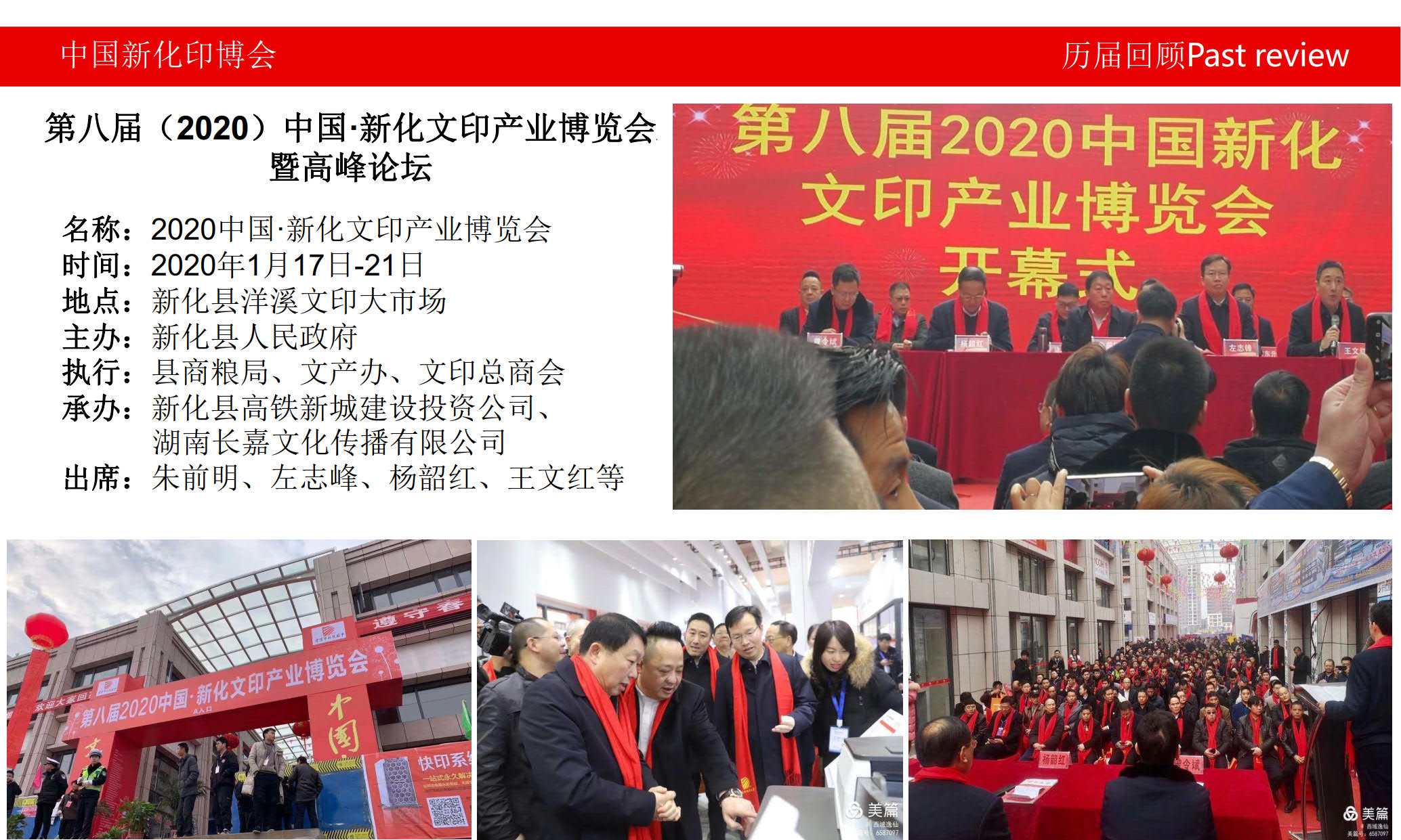 展会举办:中国·新化文印产业博览会简称“中国新化印博会”,由新化县人民政府主办、县商务粮食局主管、新化县高铁新城和县经贸促进会执行,由商务部重点联系的会展企业湖南长嘉文化传播有限公司创办并承办,以“中国新化,文印天下”为主题;为新化文印千亿产业搭建展示、交易、发展、招商引资平台。