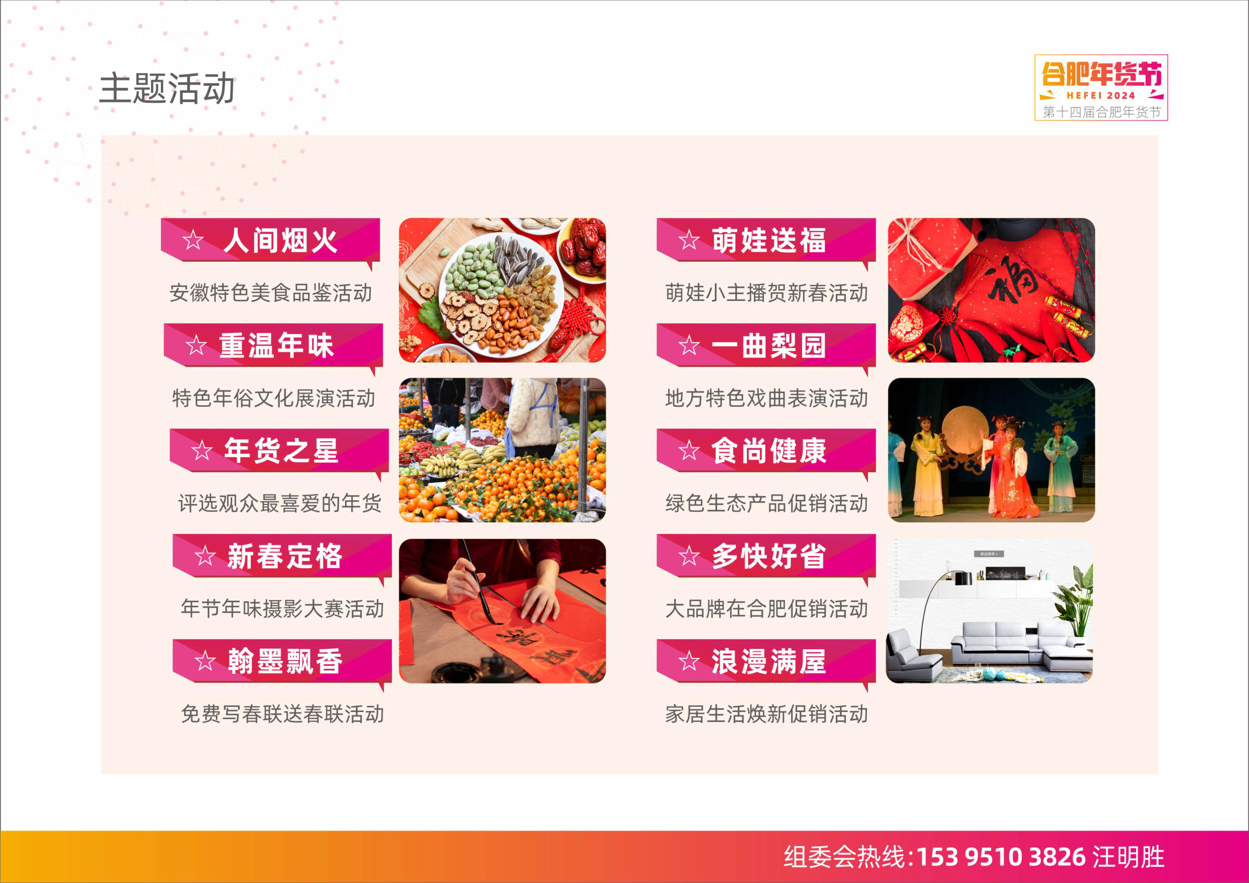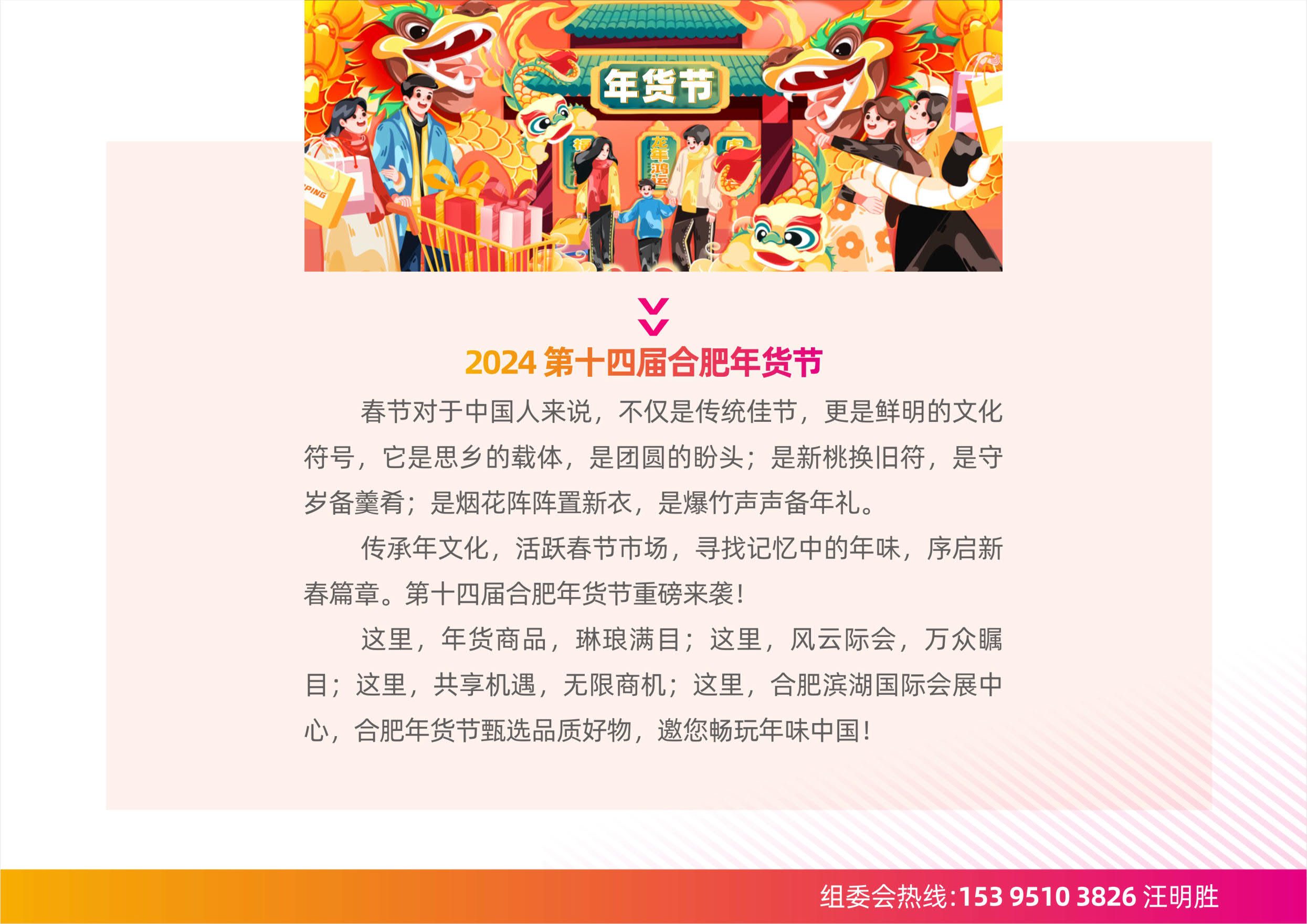 合肥年货展成功举办13届,国内规模较大人气较旺的年货商品交易盛会规模空前 6万+展览面积、10万+优选产品、15万+采购观众强势曝光 100+宣传媒体,线上线下全方位高强度曝光品牌为进一步活跃春节市场,传承中国传统文化,为快消品行业消费提振按下加速键,在以往成功办会的基础上,持续打造全国知名的年货会展品牌,将于春节前在合肥滨湖国际会展中心继续举办第十四届合肥年货节(以下简称“合肥年货节”)。