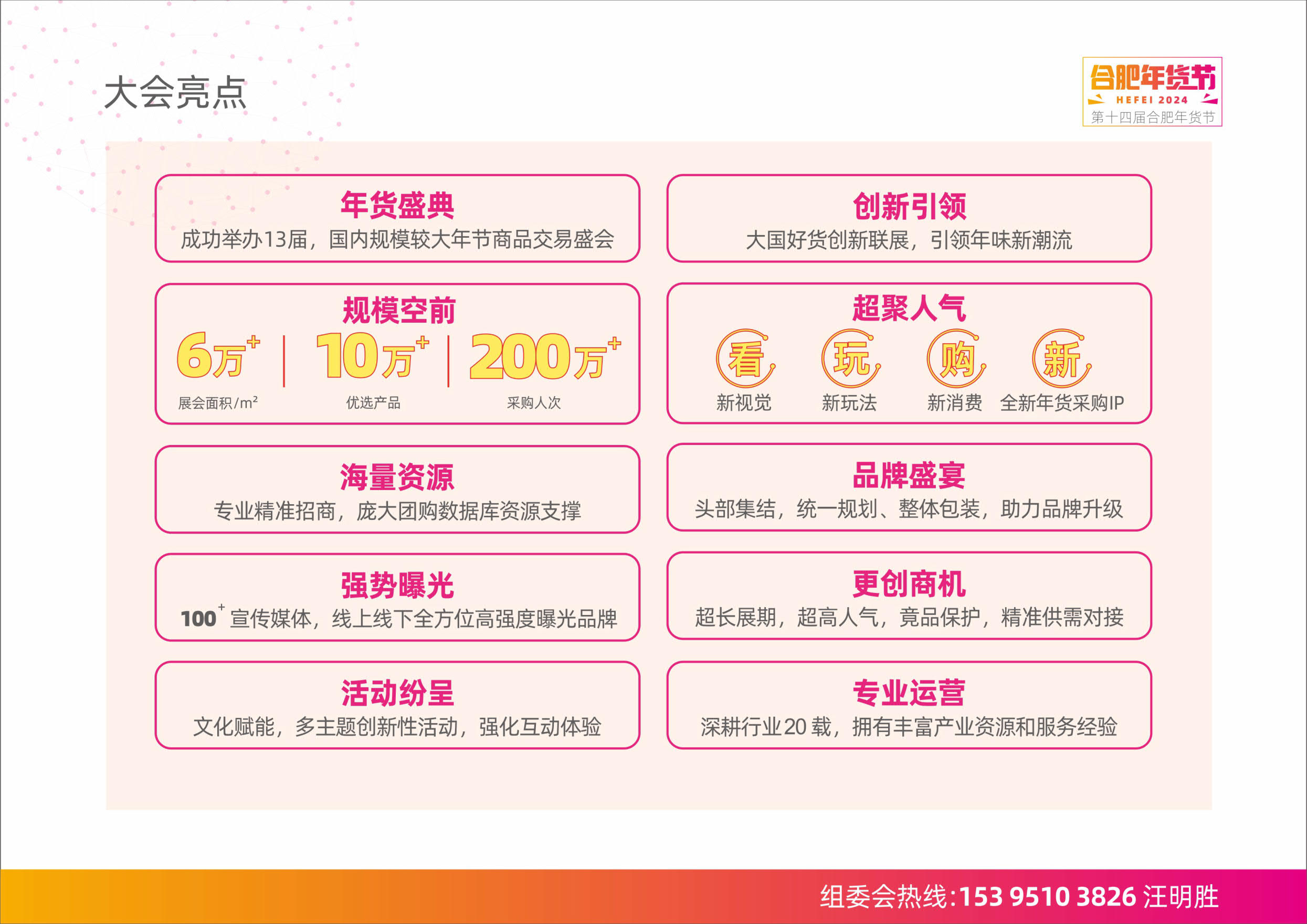 内容摘要: 合肥年货展成功举办13届,国内规模较大人气较旺的年货商品交易盛会规模空前 6万+展览面积、10万+优选产品、15万+采购观众强势曝光 100+宣传媒体,线上线下全方位高强度曝光品牌为进……