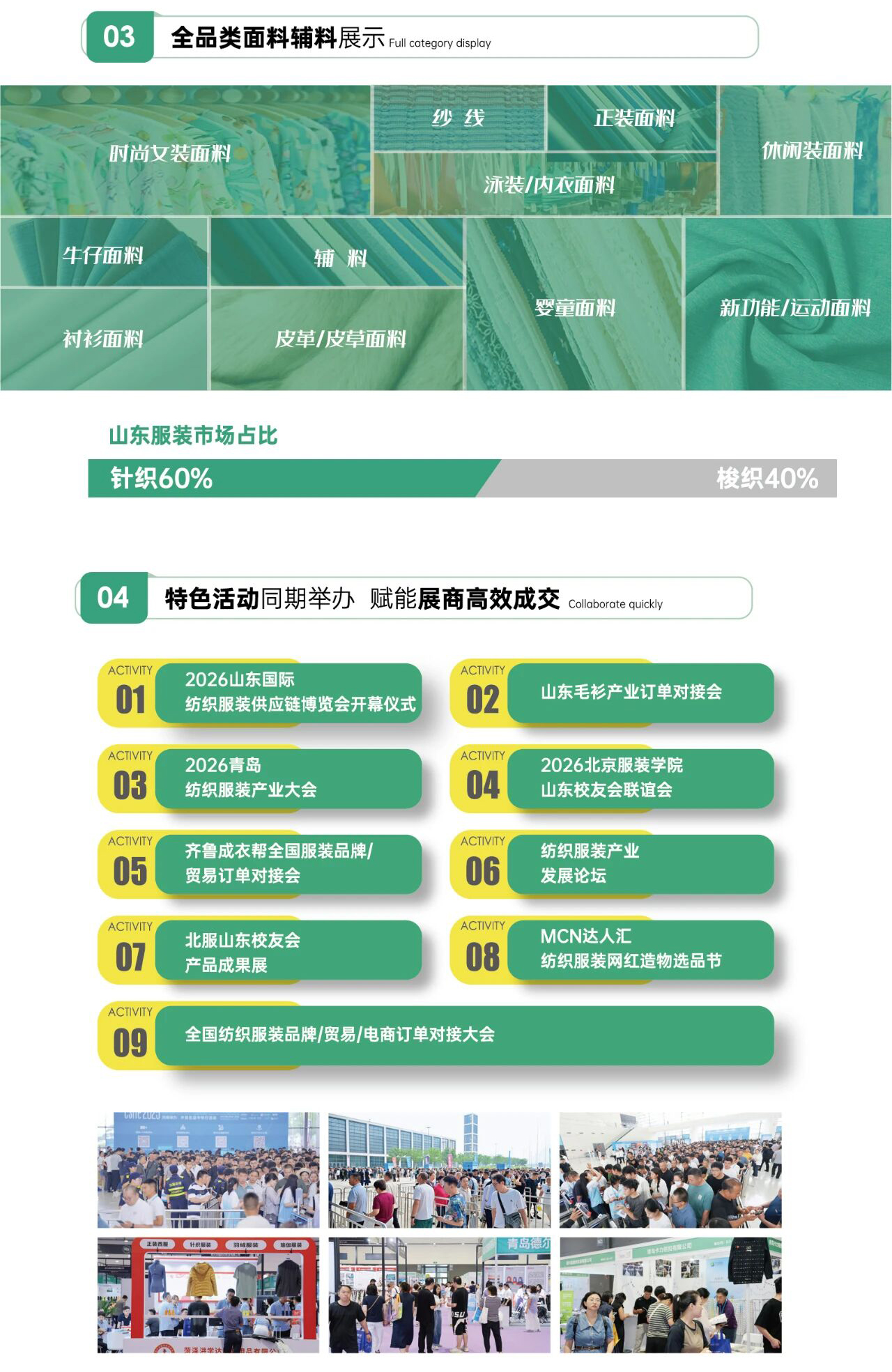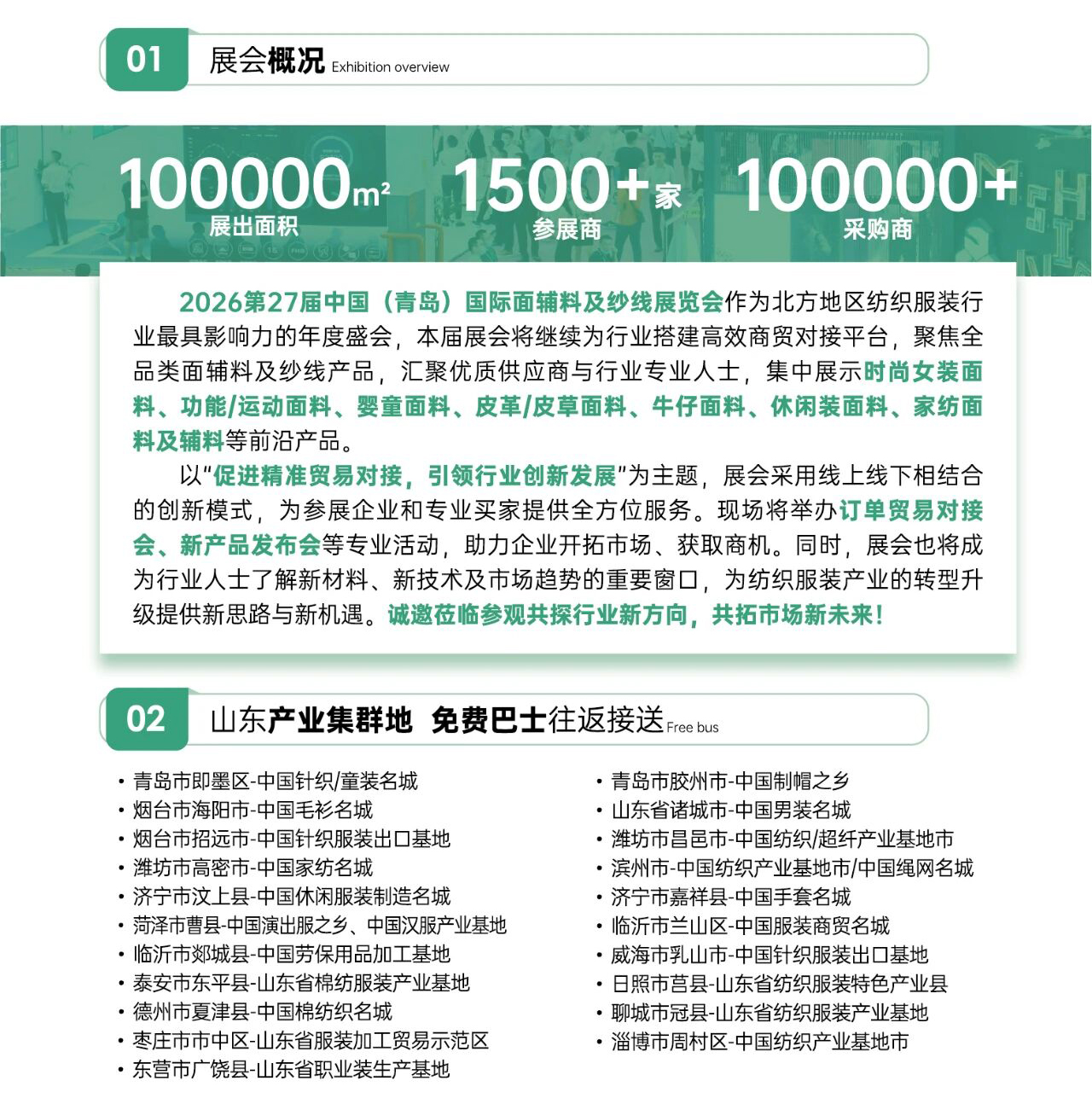 以“促进精准贸易对接,引领行业创新发展"为主题,展会采用线上线下相结合的创新模式,为参展企业和专业买家提供全方位服务。现场将举办订单贸易对接会、新产品发布会等专业活动,助力企业开拓市场、获取商机。同时,展会也将成为行业人士了解新材料、新技术及市场趋势的重要窗口,为纺织服装产业的转型升级提供新思路与新机遇。诚邀莅临参观共探行业新方向,共拓市场新未来!