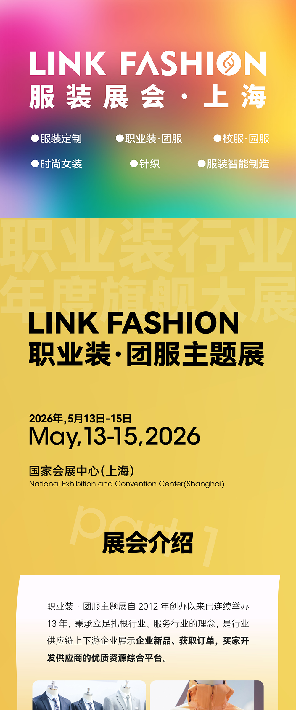 2026年5月13-15日,LINK FASHION服装展会(上海)盛大举办!服装定制、职业装·团服、校服·园服、时尚女装、针织、服装智能制造六大主题璀璨集结,2000+品质源头工厂与品牌商,共同为您呈现前沿趋势、新品爆品与高效的供应链资源。