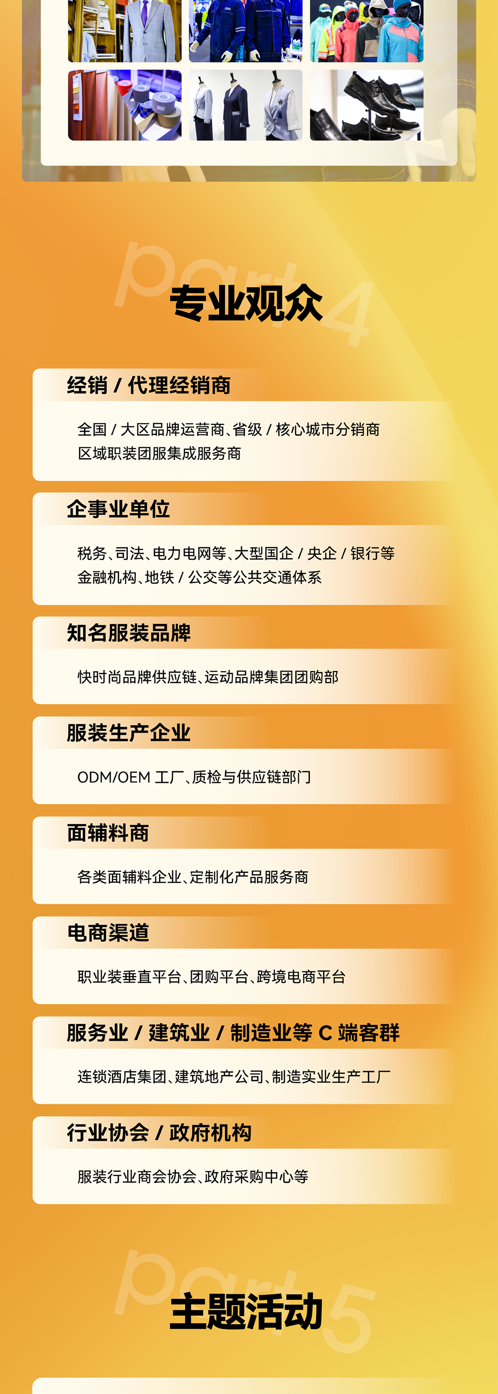职业装·团服主题展自2012年创办以来已连续举办13年,秉承立足扎根行业、服务行业的理念,是行业供应链上下游企业展示企业新品、获取订单,买家开发供应商的优质资源综合平台。