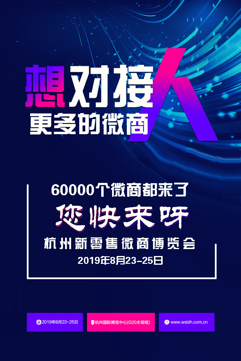 致力于服务微商行业,助力企业向新零售微商全面转型的行业盛会,杭州新零售博览会奖于2019年8月23-25在杭州国际博览中心(G20主场馆)举办。本次展会 参展范围涉及新零售及美业健康电商全产业(化妆品、彩妆、日化、洗化、美体、养生、人个护理、成人用品、孕婴童用品)等行业和微商及社交电商服务集群,博览会立足杭州,辐射全球、涉及200多个国家和地区,展会云集中外品牌企业和优质产品、网罗全球优质买家,整合各方优势资源,全面助力涉足新零售企业的全面改革。