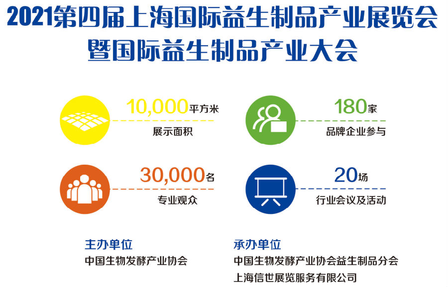 “2021第四届上海国际益生制品产业展览会”将于2021年8月25日-27日在上海新国际博览中心举办。该展会由中国生物发酵产业协会主办,上海信世展览服务有限公司承办。此次展会内将设“益生菌”、“益生元”、“保健食品、功能性食品”、“益生制品”、“膳食补充剂专区”、“包装技术设备”等主题展区,为益生制品行业和相关行业搭建了一个技术交流、促进合作、扩大上下游贸易、提高品牌和企业知名度的平台。为充分利用这一平台,向上下游企业和益生制品及相关行业展示新产品、新技术,赢得市场认知度及品牌效益。