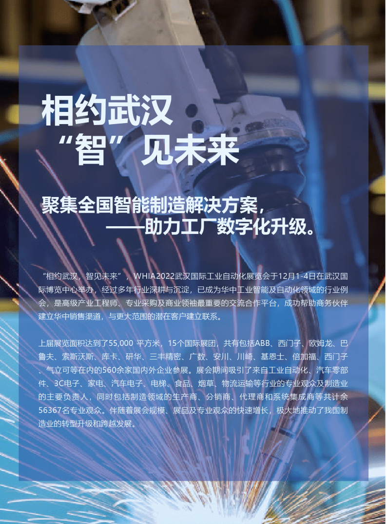 WHIA2022武汉国际工业自动化展览会将于12月1-4日在武汉国际博览中心举办,为期三天展出时间,更多产品和工、装、配技术展览以及更多的参会者!今年,AH CHINA武汉吸引了来自 23 个国家和地区近 47,800 名参会者,共同体验了今年大会主题 — “工业创新,智造未来”,了解工装配对我们国家智能制造的影响,探索与未来工厂的产品和技术。