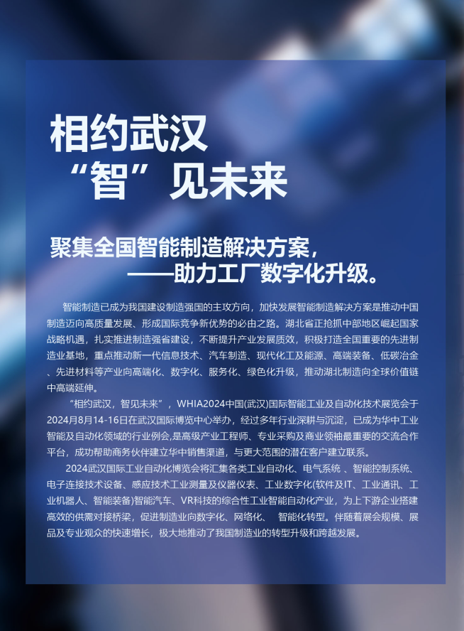 2024武汉中国国际智能装备工业自动化展览会于2024年8月14-16日在武汉国际博览中心举办,为期四天展出时间,更多产品和工、装、配技术展览以及更多的参会者!今年,AH CHINA武汉吸引了来自 23 个国家和地区近 47,800 名参会者,共同体验了今年大会主题 — “工业创新,智造未来”,了解工装配对我们国家智能制造的影响,探索与未来工厂的产品和技术。