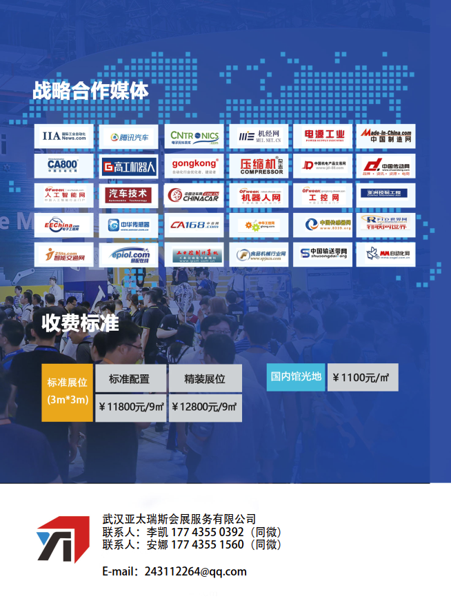 标准展位9m²(3m×3m);配置:展出场地、三面展板(高2.5m)、一块中英文楣板 、一 张洽谈桌、二把椅子、地毯、220V电源、二支射灯。双开口位置另外加收10%的参展费用。