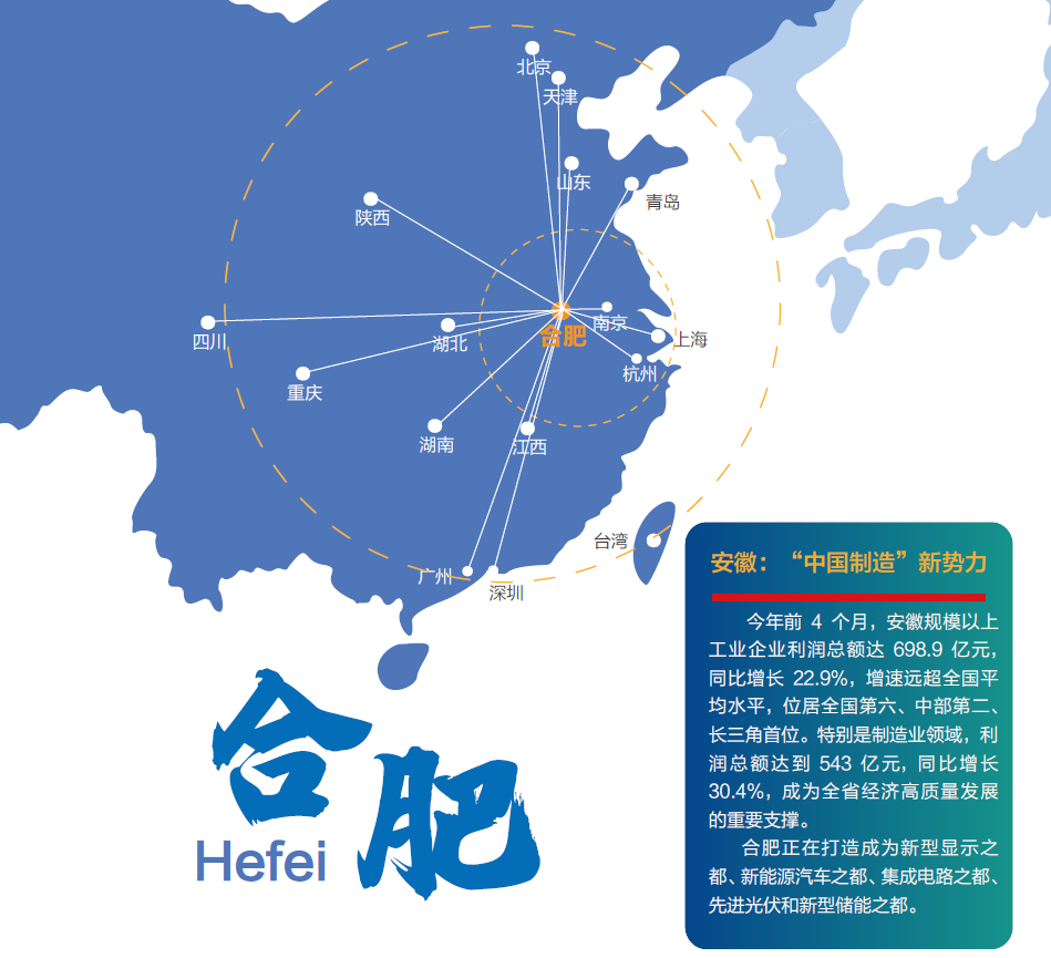 今年前4 个月,安徽规模以上工业企业利润总额达698.9 亿元,同比增长22.9%,增速远超全国平均水平,位居全国第六、中部第二、长三角首位。特别是制造业领域,利润总额达到543 亿元,同比增长30.4%,成为全省经济高质量发展的重要支撑。合肥正在打造成为新型显示之都、新能源汽车之都、集成电路之都、先进光伏和新型储能之都。