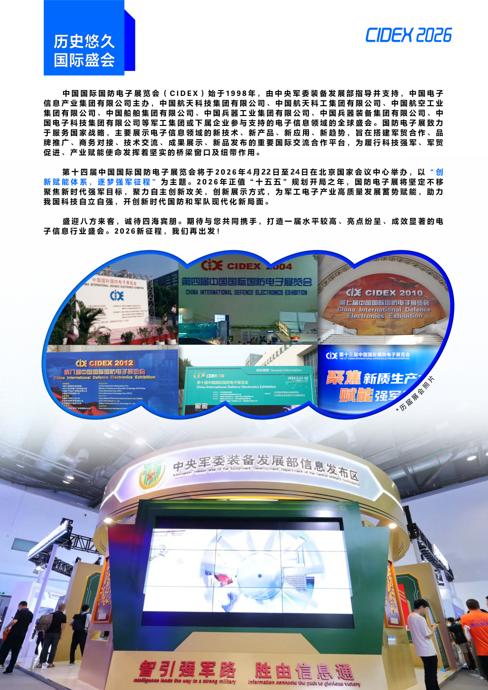 第十四届中国国际国防电子展览会将于2026年4月22日至24日在北京国家会议中心举办,以 “ 创新赋能体系,逐梦强军征程”