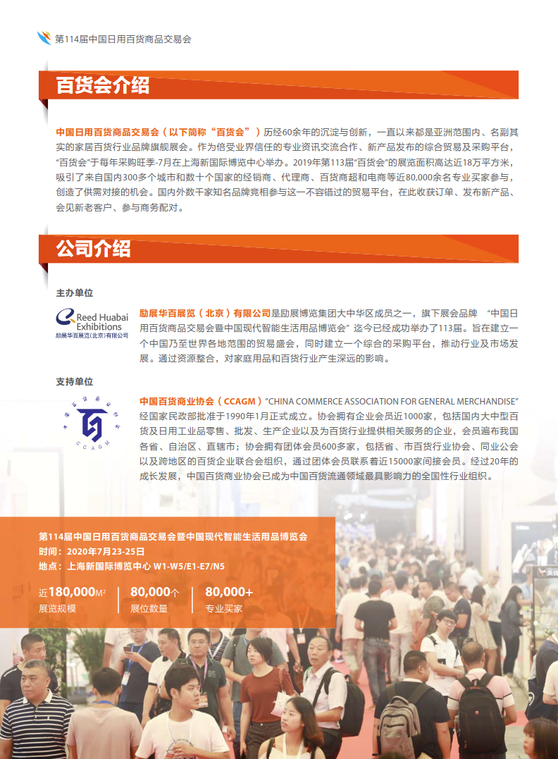 中国日用百货商品交易会(以下简称“百货会”)历经60余年的沉淀与创新,一直以来都是亚洲范围内、名副其 实的家居百货行业品牌旗舰展会。作为倍受业界信任的专业资讯交流合作、新产品发布的综合贸易及采购平台, “百货会”于每年采购旺季-7月在上海新国际博览中心举办。2019年第113届“百货会”的展览面积高达近18万平方米, 吸引了来自国内300多个城市和数十个国家的经销商、代理商、百货商超和电商等近80,000余名专业买家参与, 创造了供需对接的机会。国内外数千家知名品牌竞相参与这一不容错过的贸易平台,在此收获订单、发布新产品、 会见新老客户、参与商务配对。